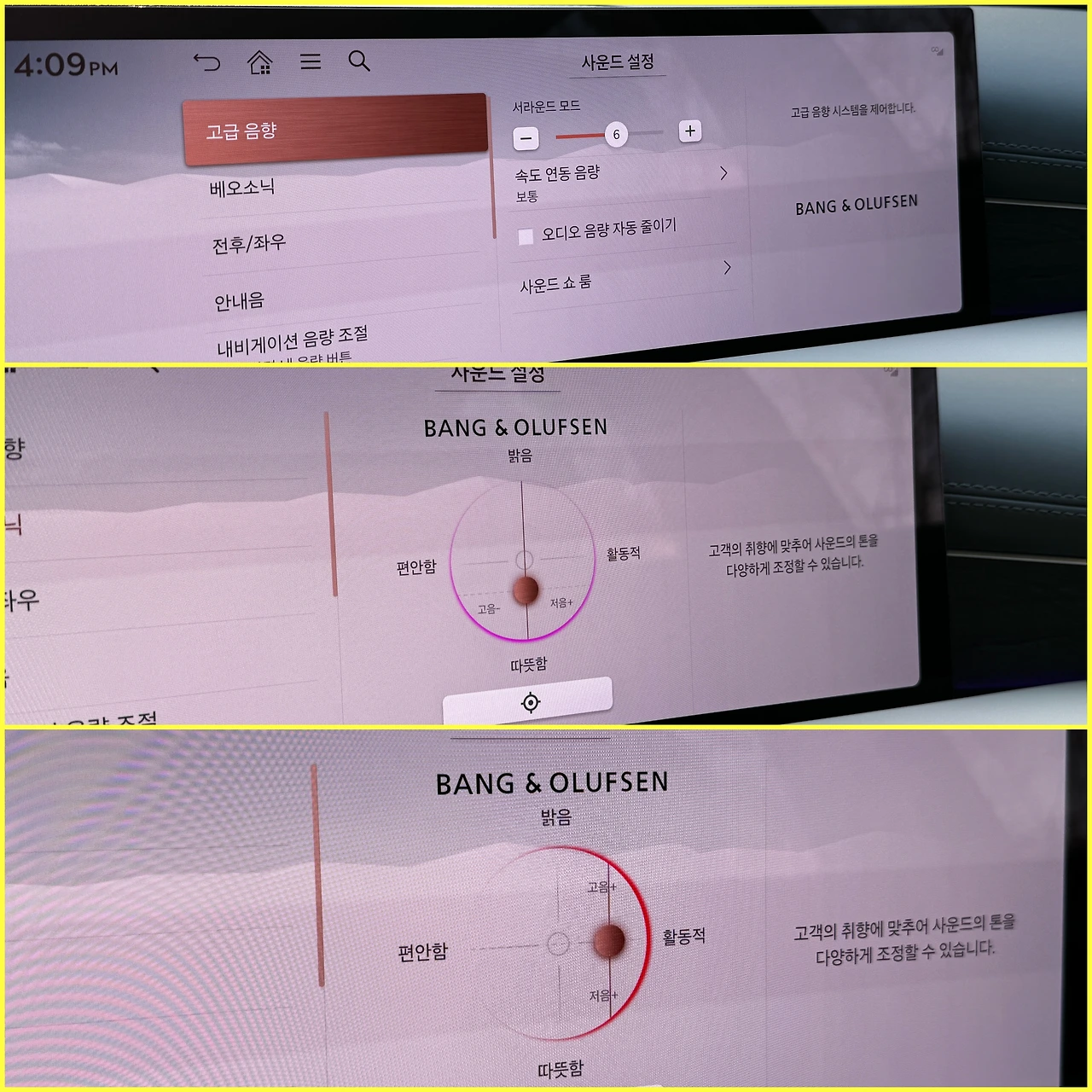 이 사진은, 뱅앤올룹슨 사운드 시스템의 세팅 화면입니다. 기존의 스테레오 사운드로 음장감을 만들었던 녹음 파일들(개인적으로 CD에서 추출한 ‘이글스’ <호텔 캘리포니아> M TV 라이브)은 약간 충돌이 생기더군요. 넓게 퍼진 스테이지가 되려 좁아지고 흐려지는 느낌이라, 소스의 녹음 수준에 따라 서라운드는 선택적으로 운영하는 것이 좋겠다 생각이 듭니다. B&O 특유의 사운드 설정은 저음/고음의 양을 조절하는 건데… 이것도 프리셋 세 개쯤을 만들어 음악에 따라 쉽게 선택할 수 있었으면 좋겠더군요.