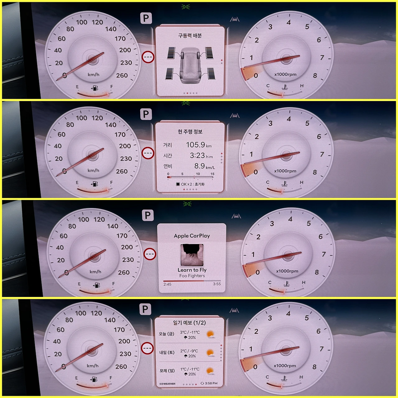 계기판과 AVN 사이의 공간이 스티어링 휠 림에 가리는 건 압니다. 근데 거기에 현재 재생 중인 미디어나 날씨 등 가벼운 정보를 보여주먼 안 되나요? 트립미터나 타이어 공기압, 구동력 배분 등 차 관련 내용은 센터에 띄우고, 미디어와 날씨 같은 부가 정보는 AVN 사이에 넣으면 될 텐데요. 아래 사진의 기능을 나눠서요. 글씨나 화면 가린다고 뭐라 하는 걸 걱정해 이렇게 만든 거라면, 진짜 구더기 무서워 장 못 담근 겁니다.