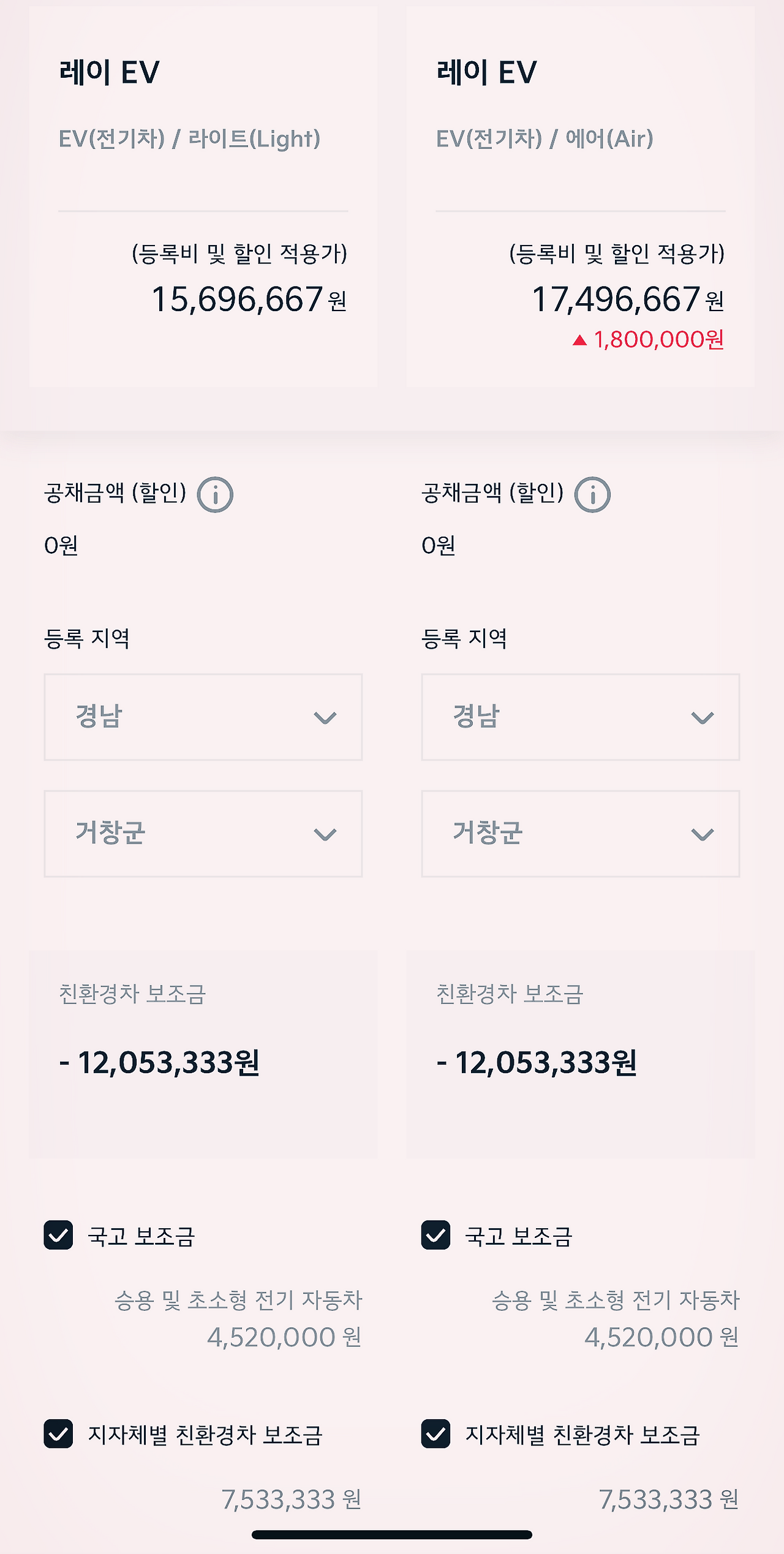 기아 홈페이지에 올라온 내용에는 국고보조금 452만 원+지자체 보조금이 가장 적은 서울이 117만 9130원으로 실 구매가는 2385만870원이랍니다. 경남 거창이 753만3333원으로 보조금 총액이 1205만3333원이라 실구매가가 1749만6667원까지 떨어집니다. 지자체 보조금 차이가 꽤 큽니다.