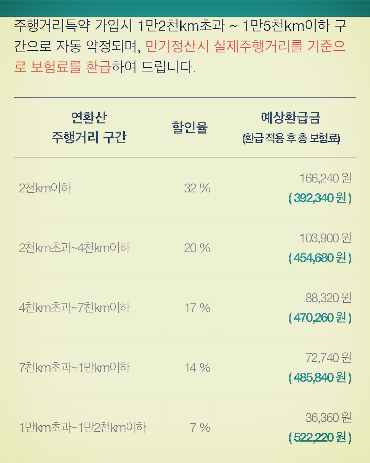 지금 여기 계산한 것들은 다 마일리지 특약 할인을 받기 전 금액이거든요. 물론 보험사마다 기준 주행거리와 할인율이 다릅니다.