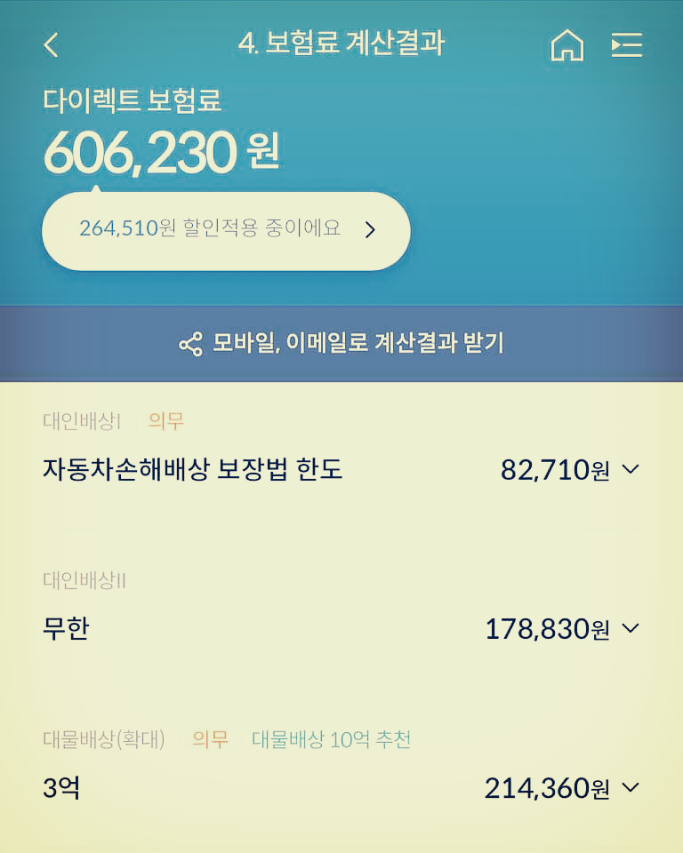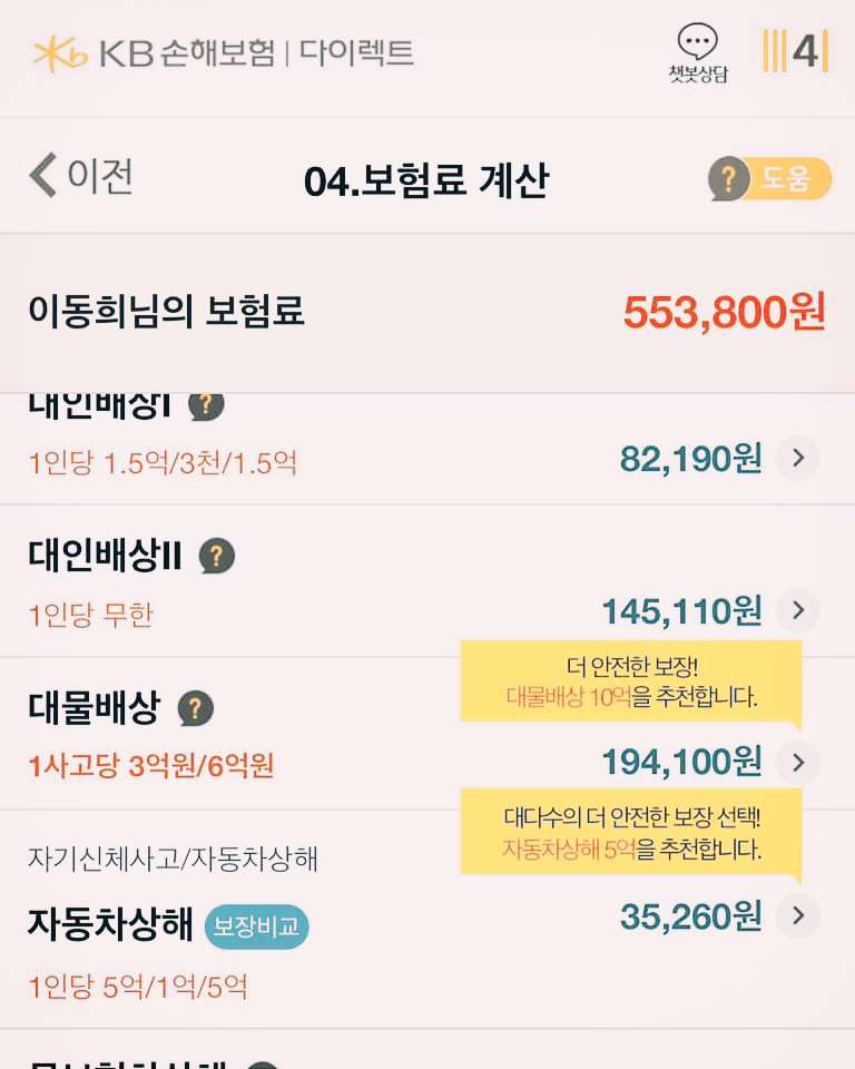 이런 보험료 비교를 할 때 중요한 건 담보범위를 똑같이 맞추는 겁니다. 의무보험을 제외한 대물배상, 자기신체사고/상해보험 등에 해당합니다. 저는 대체로 대물은 5억, 상해보험도 5억으로 맞췄습니다.