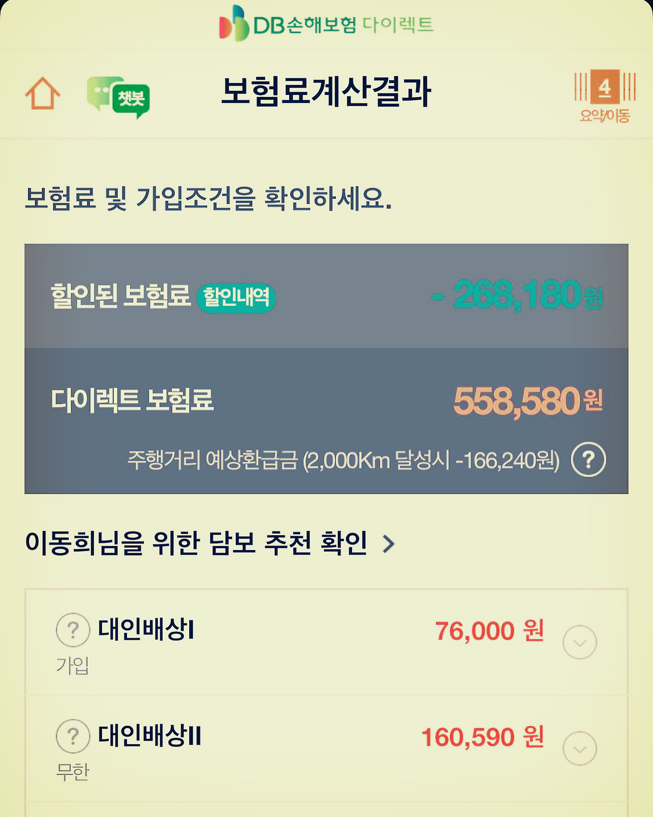 결국 DB 손해보험 다이렉트로 가입했습니다. 저 금액이 절대적이지는 않습니다. 전 1인 한정이고 견인도 50km까지로 연장하는 등 여러 조건들이 다르니까요.