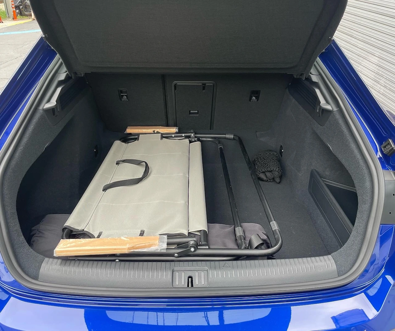 어쩌다 보니 2인용 접이식 벤치 캠핑 의자를 가지러 가야 했는데요, 시트를 접을 필요도 없이 트렁크에 쑥 들어갑니다. 집에 와 줄자로 재보니 길이가 110cm가 넘네요. 해치백 스타일로 트렁크가 열려 활용성이 더 좋습니다.