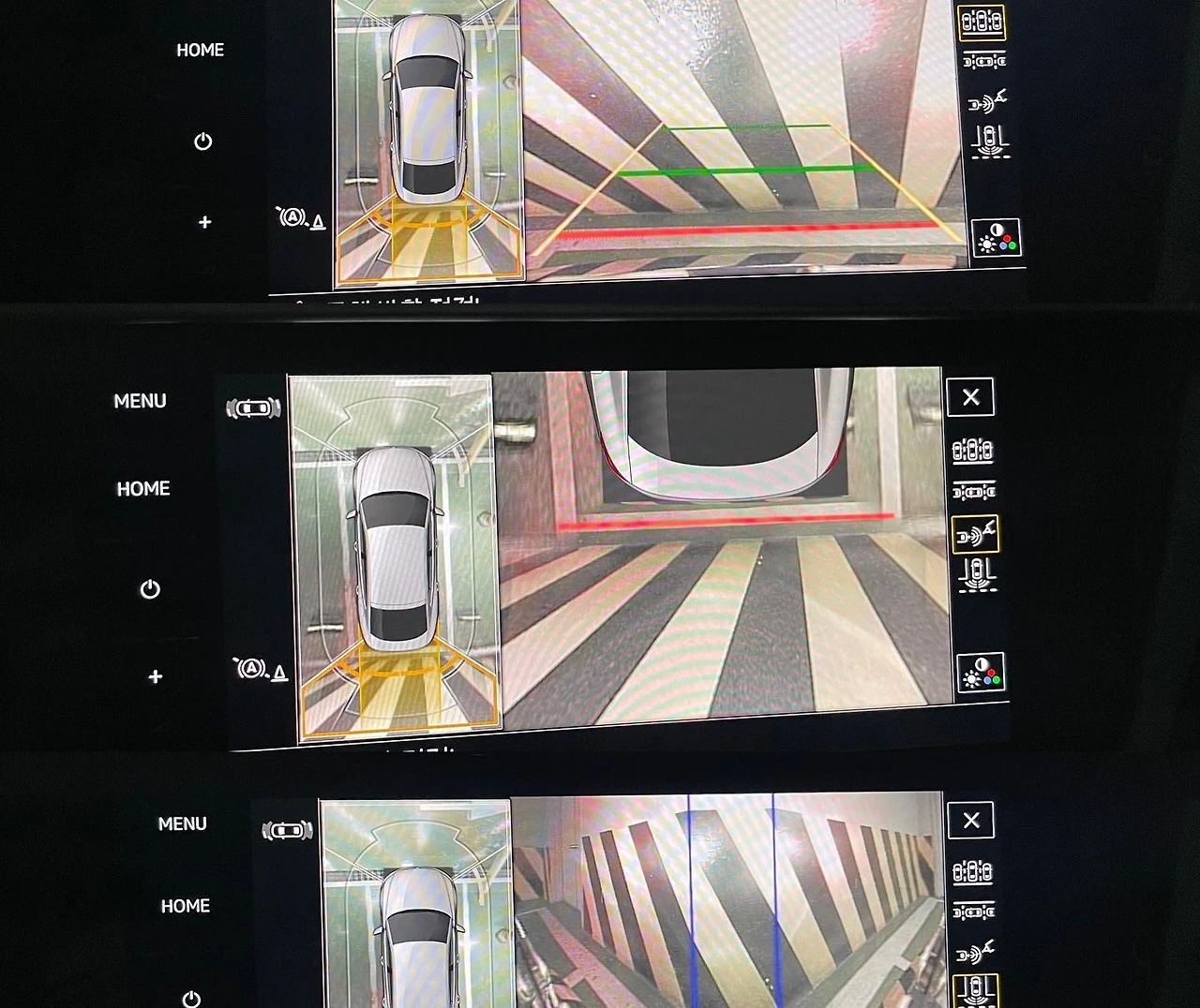 스크린들은 매우 선명하고 해상도가 좋습니다. 특히 센터 스크린은 크기가 넉넉하고 근접센서가 있어 제어하기도 편합니다. 헤드업 디스플레이는 반사판 작동이 조용한 건 좋은데 크기가 좀 작고 글씨가 흐린 건 아쉽더군요. 후방 카메라는 다양한 앵글로 전환해 볼 수 있어 주차가 편하고요. 다만 상대적으로 영상에 살짝 딜레이가 있더군요.