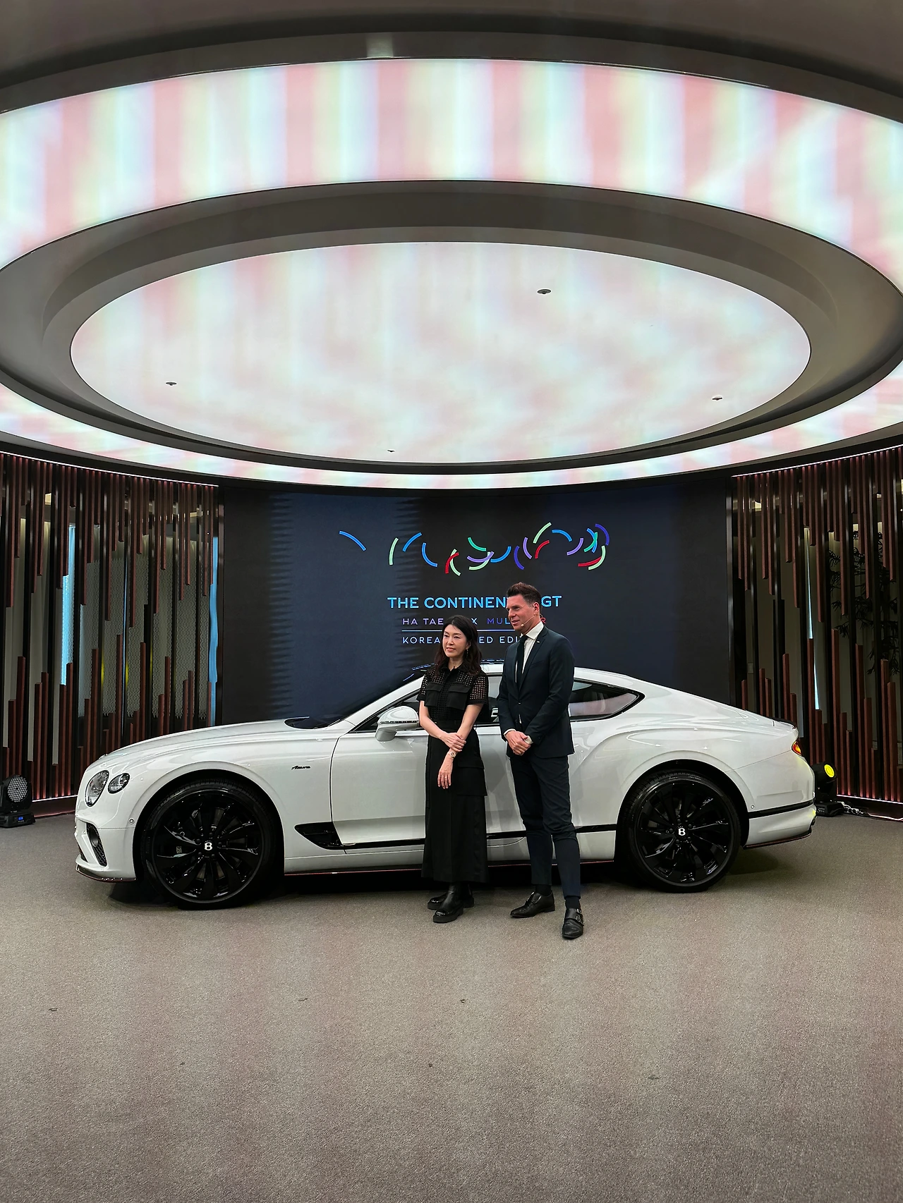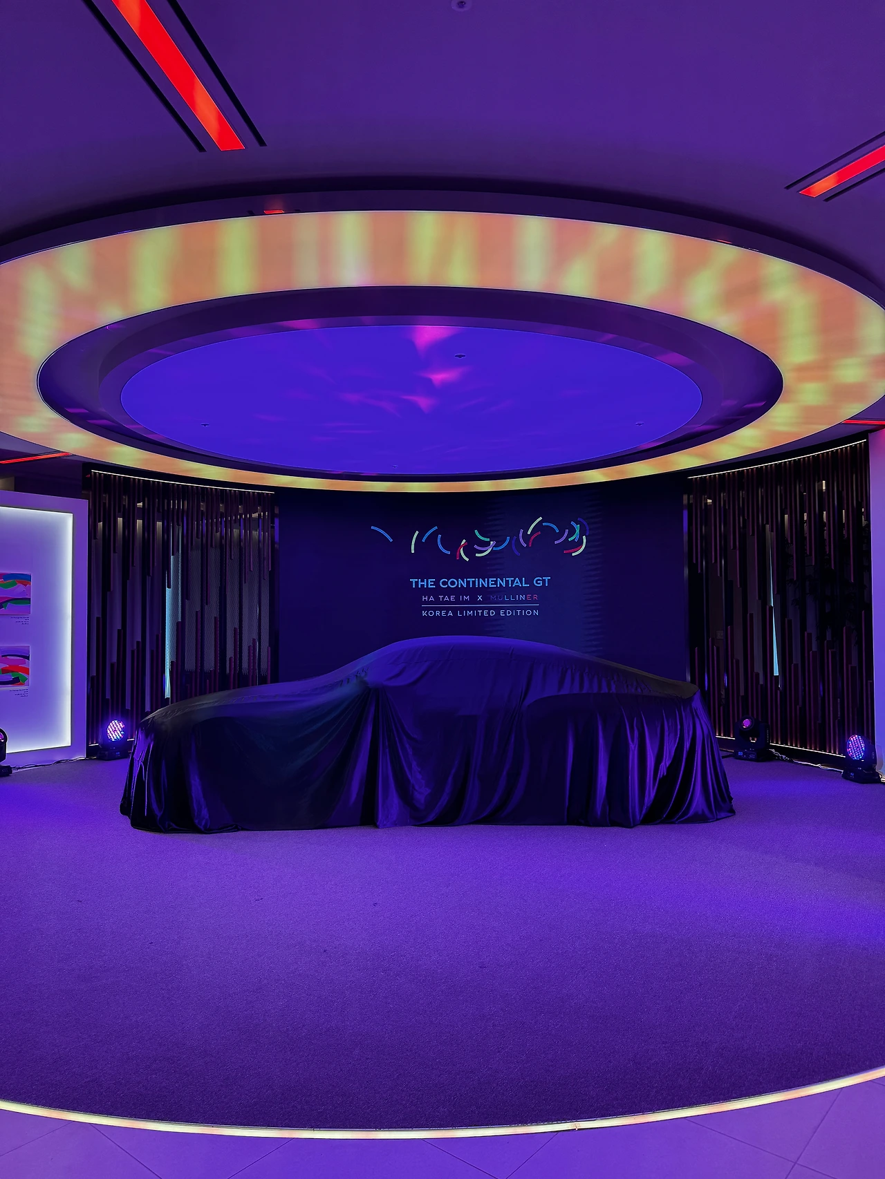 낮에 다녀온 벤틀리 컨티넨탈 GT 코리아 리미티드 에디션 론칭 현장입니다. 하태임 작가와의 컬래버레이션으로, 시그니처 포인트인 ‘컬러 밴드’가 곳곳에 들어가 있습니다.