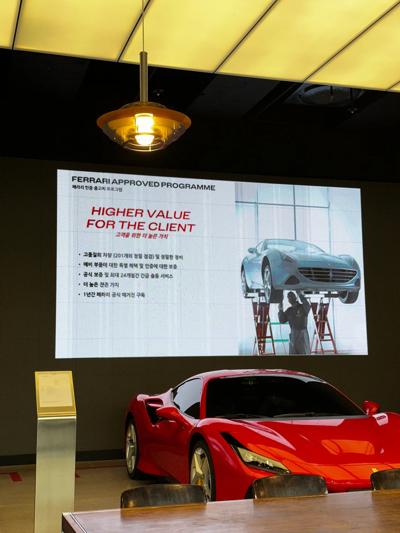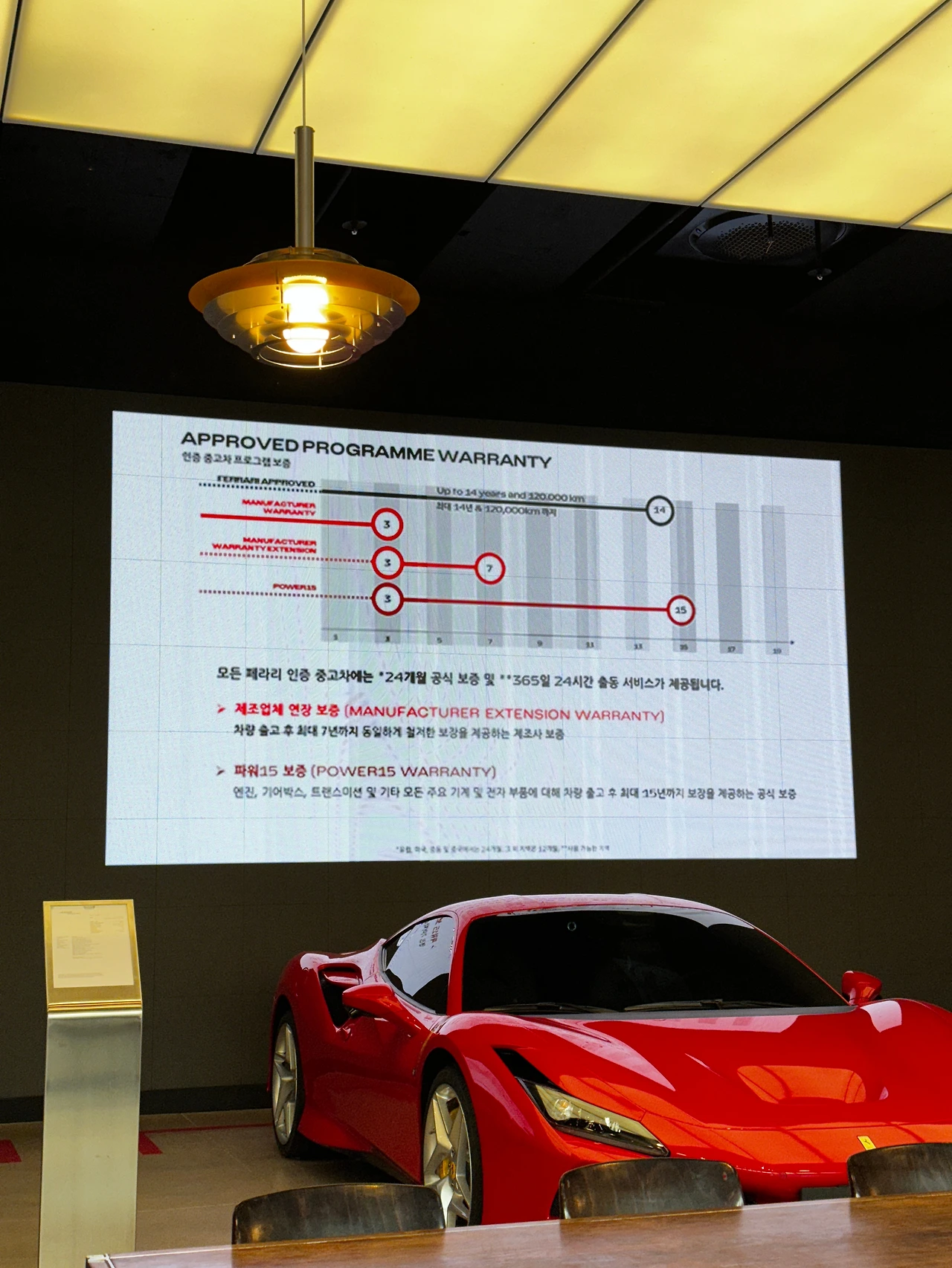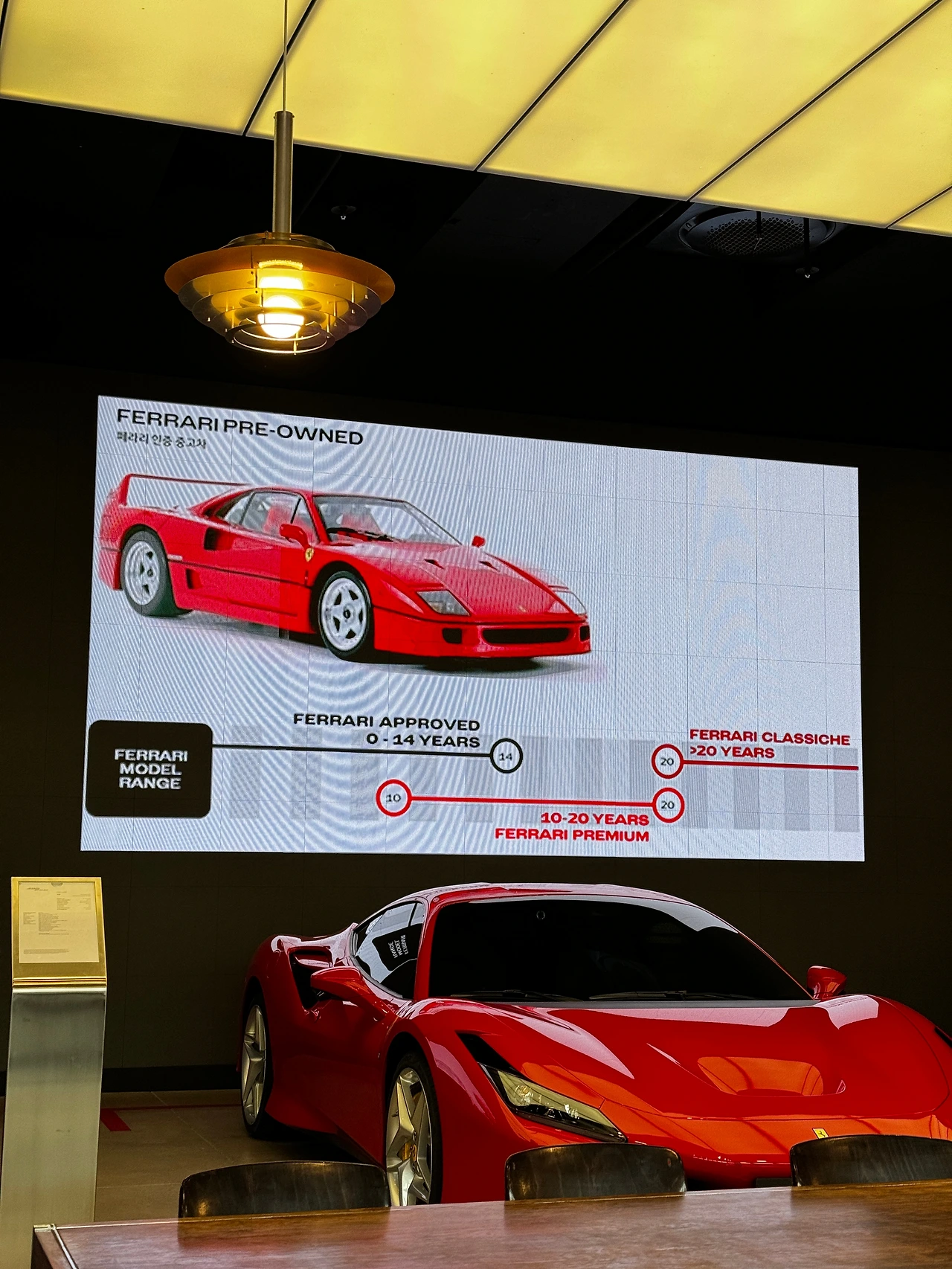 재밌는 건 판매된 차를 기간에 따라 나눈 분류법이었습니다. 일반적인 모델들은 출고 후 14년까지 인증 중고차 프로그램이 적용되고요, 특별한 모델들은 10~20년 기간 동안 페라리 프리미엄이라는 프로그램으로 관리가 된다네요. 그리고 20년을 넘으면 영어로 클래식카에 해당하는, 역시 마라넬로 본사에서 복원과 인증을 하는 페라리 클래시케가 되고요. 작년에 DDP에서 열렸던 우니베르소 페라리(Universo Ferrari)에서 봤던 차들이 그렇지요.