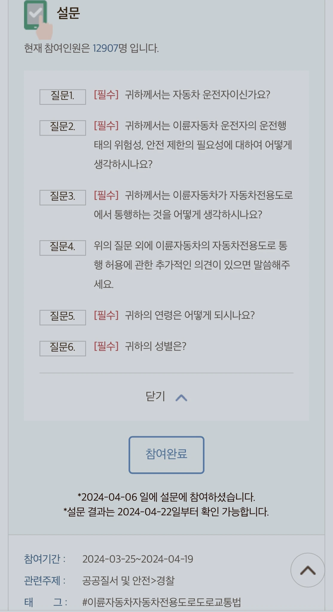 이륜자동차의 자동차 전용도로 통행. 꽤 논란이 있는 주제입니다. 국민권익위에서 이에 대한 설문조사를 하더군요.