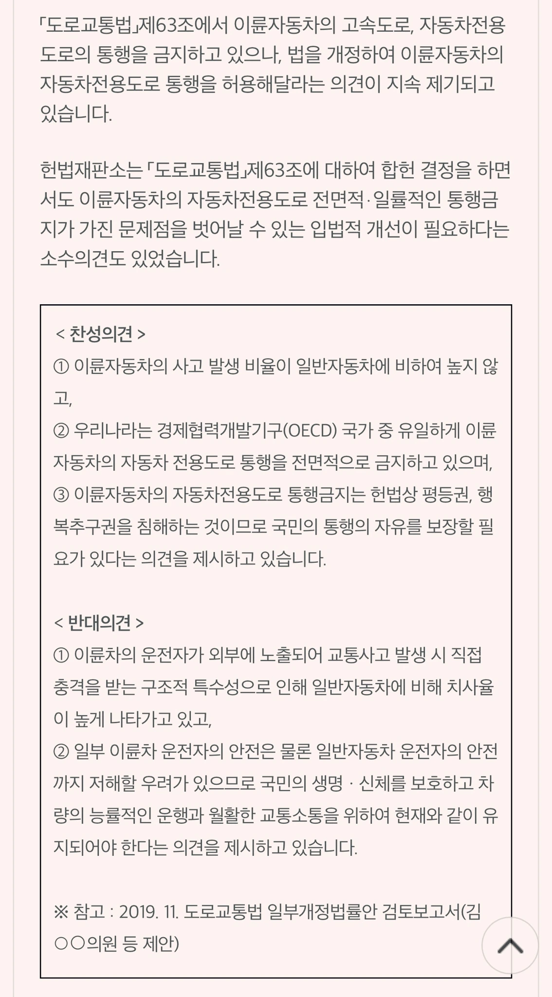 2020년에는 (벌써 몇 번째로 알고 있는) 헌법소원까지 올라갔으나 자동차 전용도로 통행을 금지한 것이 합헌이라는 결정이 났지요. 사실 88 올림픽 이전에는 이륜차도 ‘자동차’이기 때문에 고속도로 외에 올림픽대로 등에는 250cc 이상 바이크는 진입이 되었거든요.