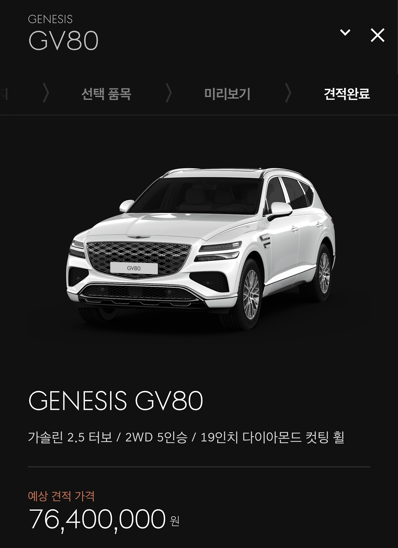 상위 모델인 GV80을, 6천930만 원인 5인승 기본형(2.5T+2WD)에 헤드업디스플레이와 드라이빙어시스턴트 패키지 I/II, 2열 컴포트 패키지가 포함된 파퓰러 패키지(710만 원)를 더하면 딱 7천640만 원입니다.