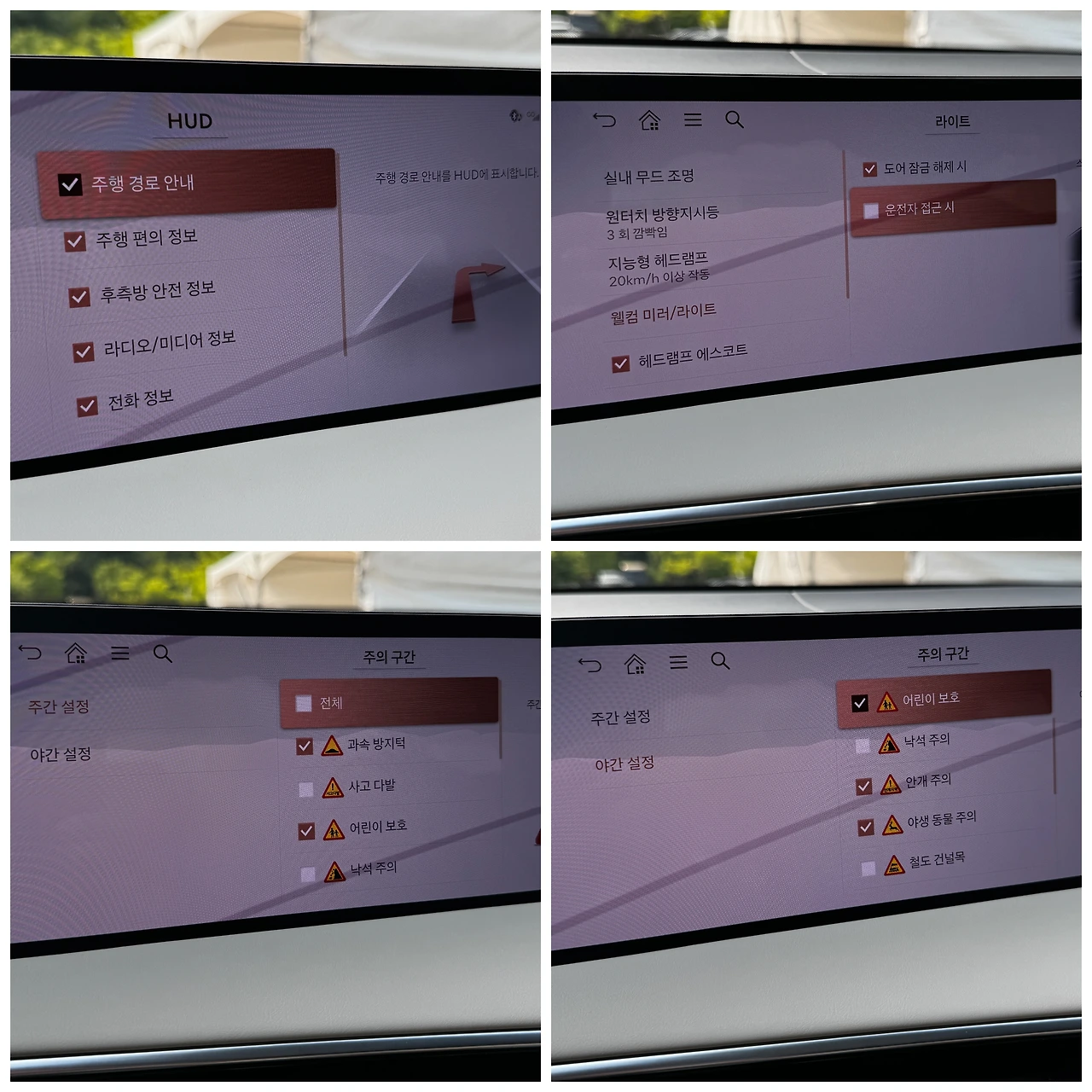 이 사진의 우측 상단은, 리모컨으로 도어를 열었을 때 차가 어떻게 반응할 것인가를 선택하게 만든 겁니다. 개인적으로 스마트키를 갖고 차에 접근할 때, 도어가 열리며 사이드 미러가 저절로 펴지는 걸 싫어합니다. 좁은 주차 공간에서 되려 불편하거든요. 열리는 미러에 옷에 이물질이 묻거나 피하는 게 귀찮았으니까요. 이게 라이트와 미러 작동을 켜고 끌 수 있도록 했습니다. 좋더라고요.