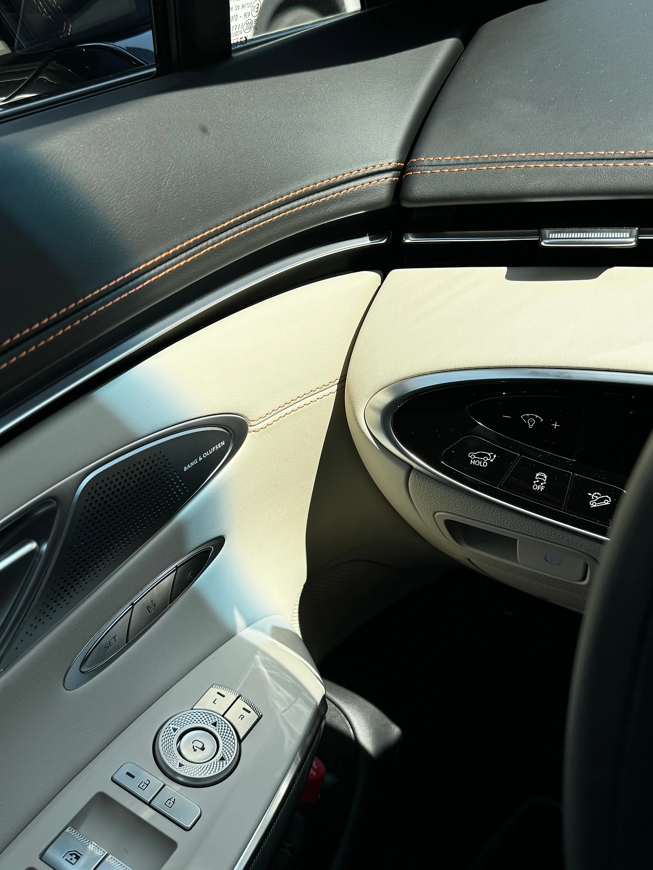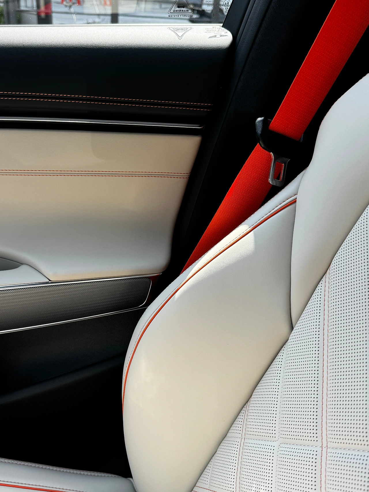 또 하나 장점은 정말 뛰어난 품질의 실내입니다. 내장재는 스포츠 패키지에서, 스포츠 디자인 셀렉션 II 중에서 옵시디언 블랙/바닐라 베이지 투톤입니다. 프라임 나파 가죽의 질감, 컬러는 물론이고 다른 내장재와의 조화도 뛰어납니다. 오렌지 컬러의 안전벨트는 시트 스티치 컬러와 매칭되는 거라 더 보기 좋고요.