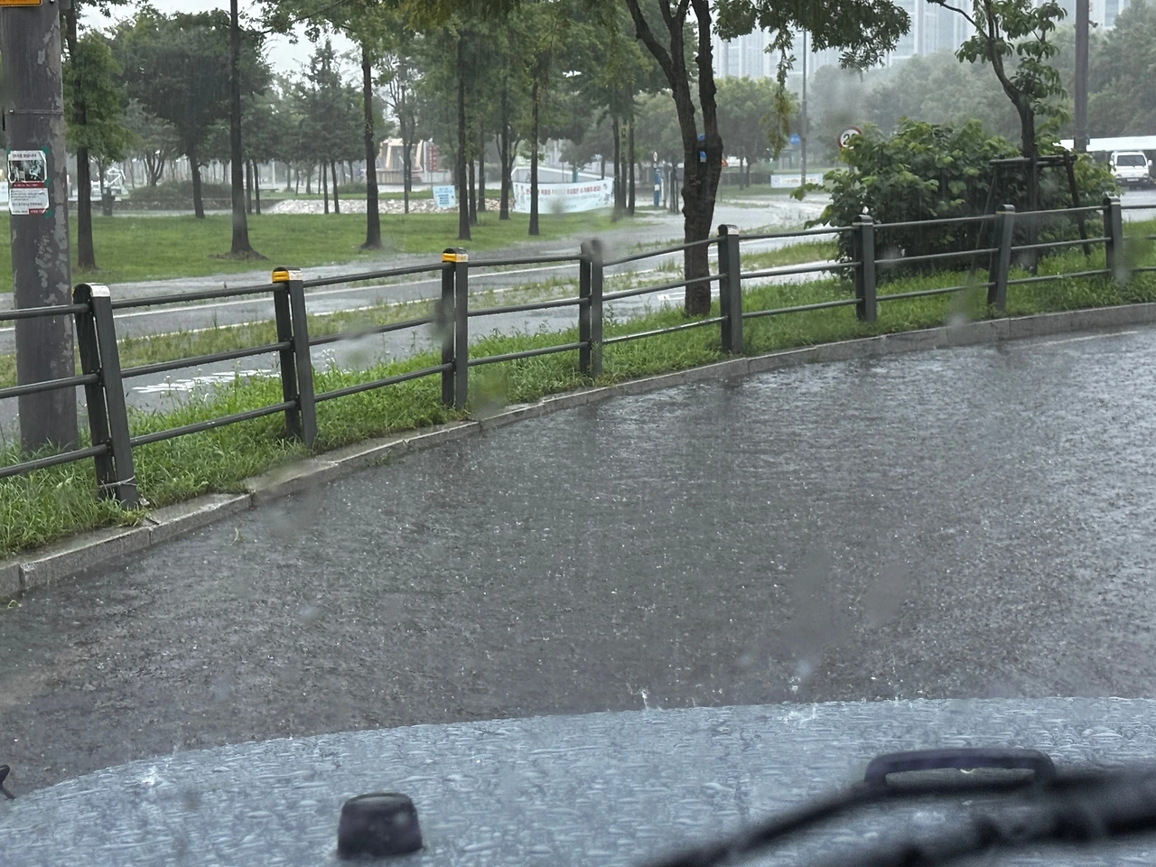그러니까, 비가 많이 와 이 사진처럼 차도와 화단을 구분하는 경계석이 저 정도로 잠겼다면 물이 얼마나 깊은 지를 가늠할 수 있게 됩니다. 지금 사진 정도라면 15~18cm 정도는 물이 차 오른 정도입니다. 만약 저 경계가 안 보인다? 20cm 이상 깊은 곳이라는 말이 됩니다.