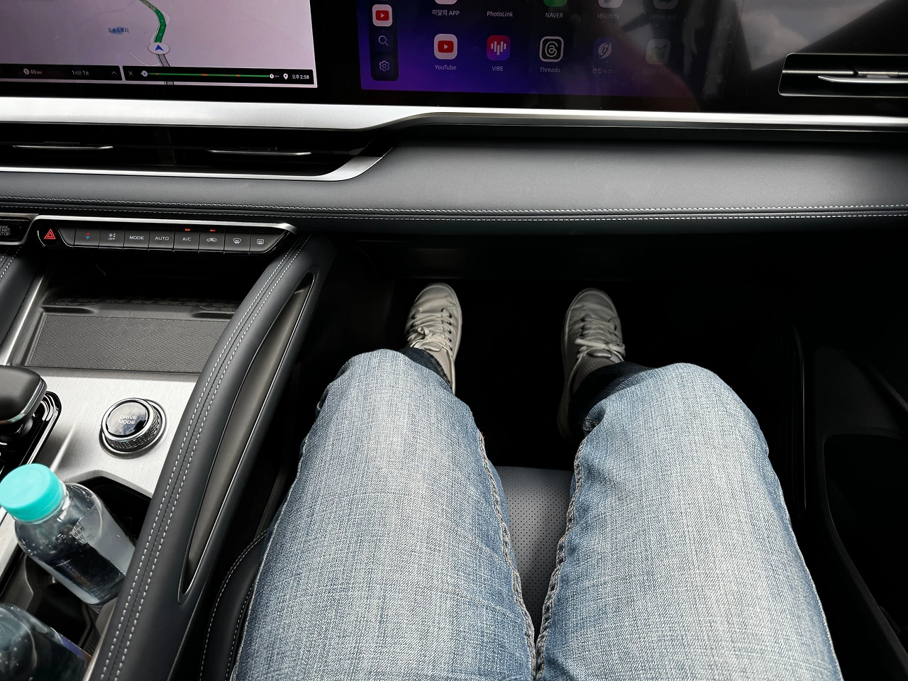 이 사진부터는 부족한 부분들입니다. 앞승객석 다리 공간이 부족합니다. 앞바퀴굴림차인데 센터 터널이 두꺼워 왼발을 바로 뻗을 수 없더군요. 이게 측면충돌 평가에서 넉넉한 안전거리 확보 때문에 앞 시트를 가운데로 민 것과 함께 자세가 좀 이상하게 잡힙니다.