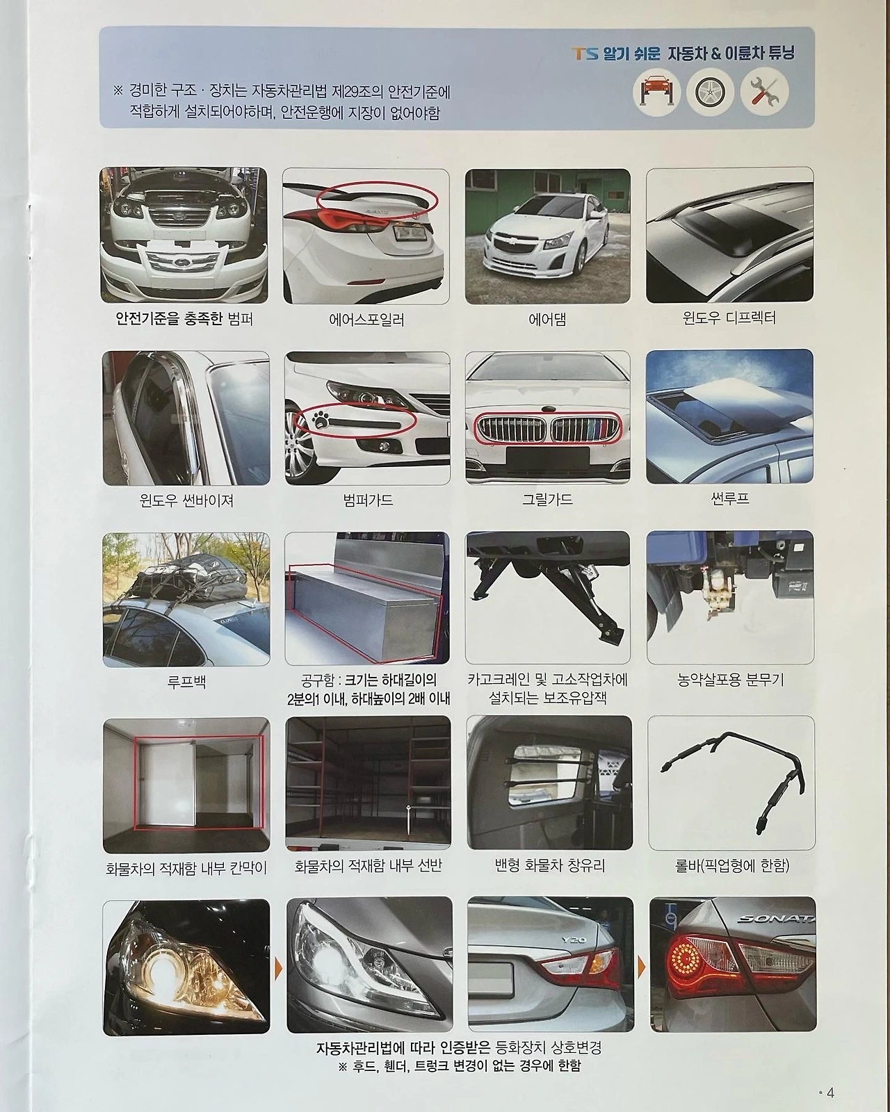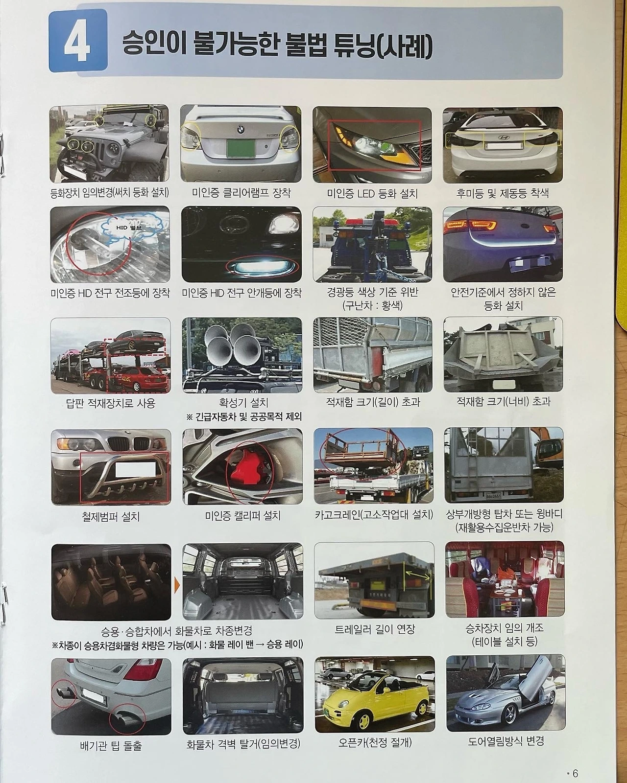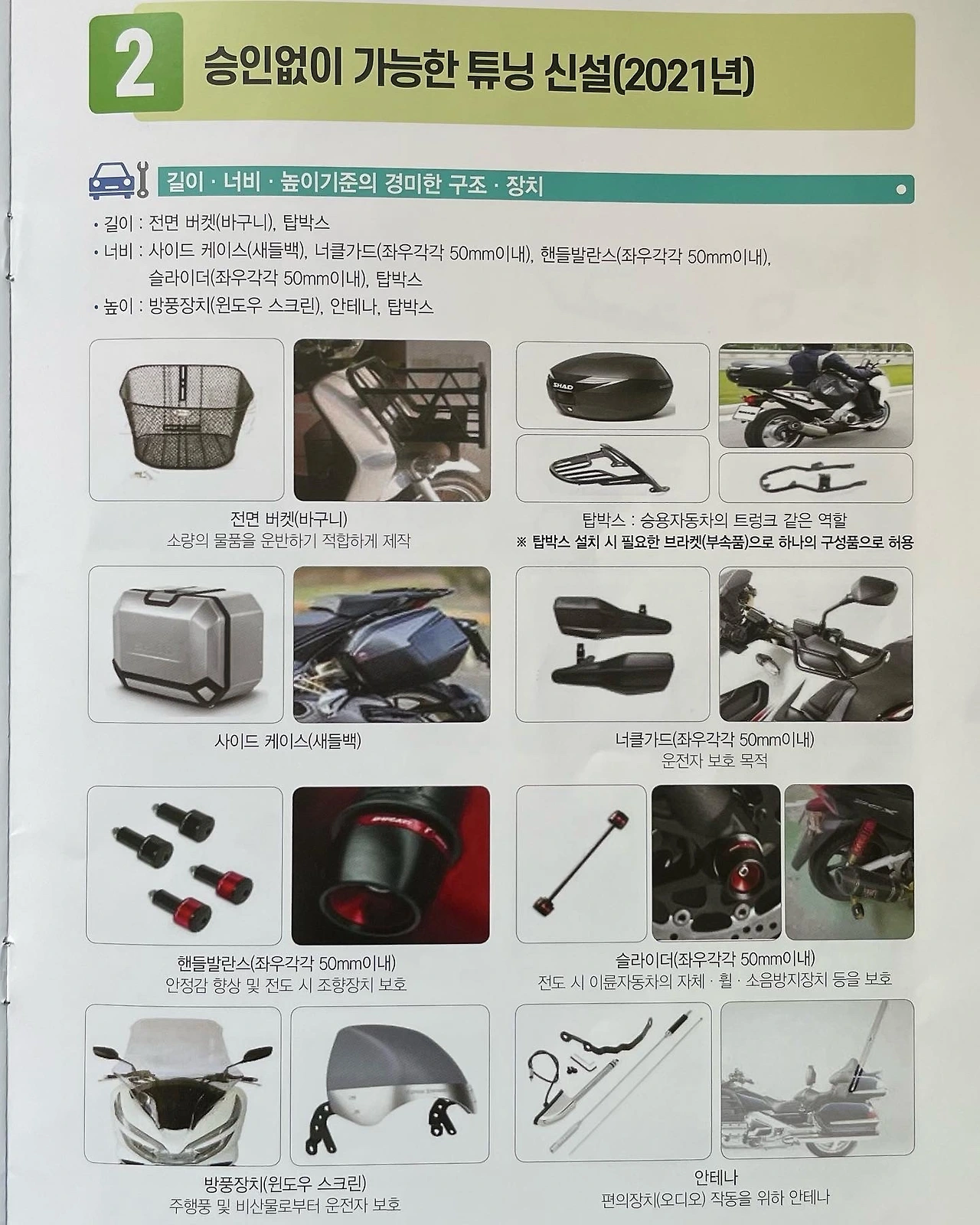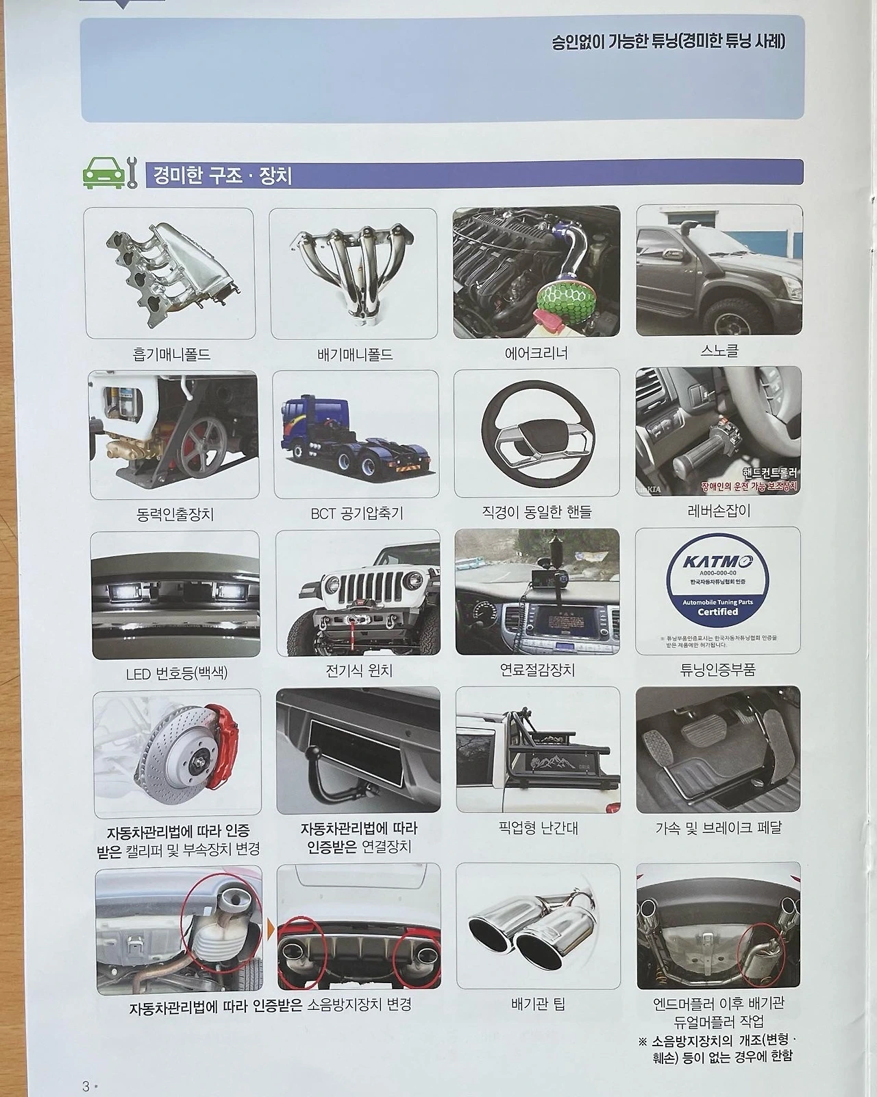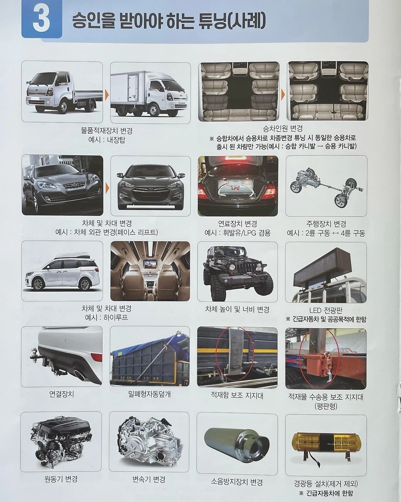 트럭과 승용차를 합친 자동차와 이륜차로 나뉘어 있고요, 각각 1. 승인 없이 할 수 있는 가벼운 튜닝, 2. 승인을 받아야 하는 튜닝, 3. 승인조차 불가능한 완전 불법 튜닝으로 나뉘어 있습니다.