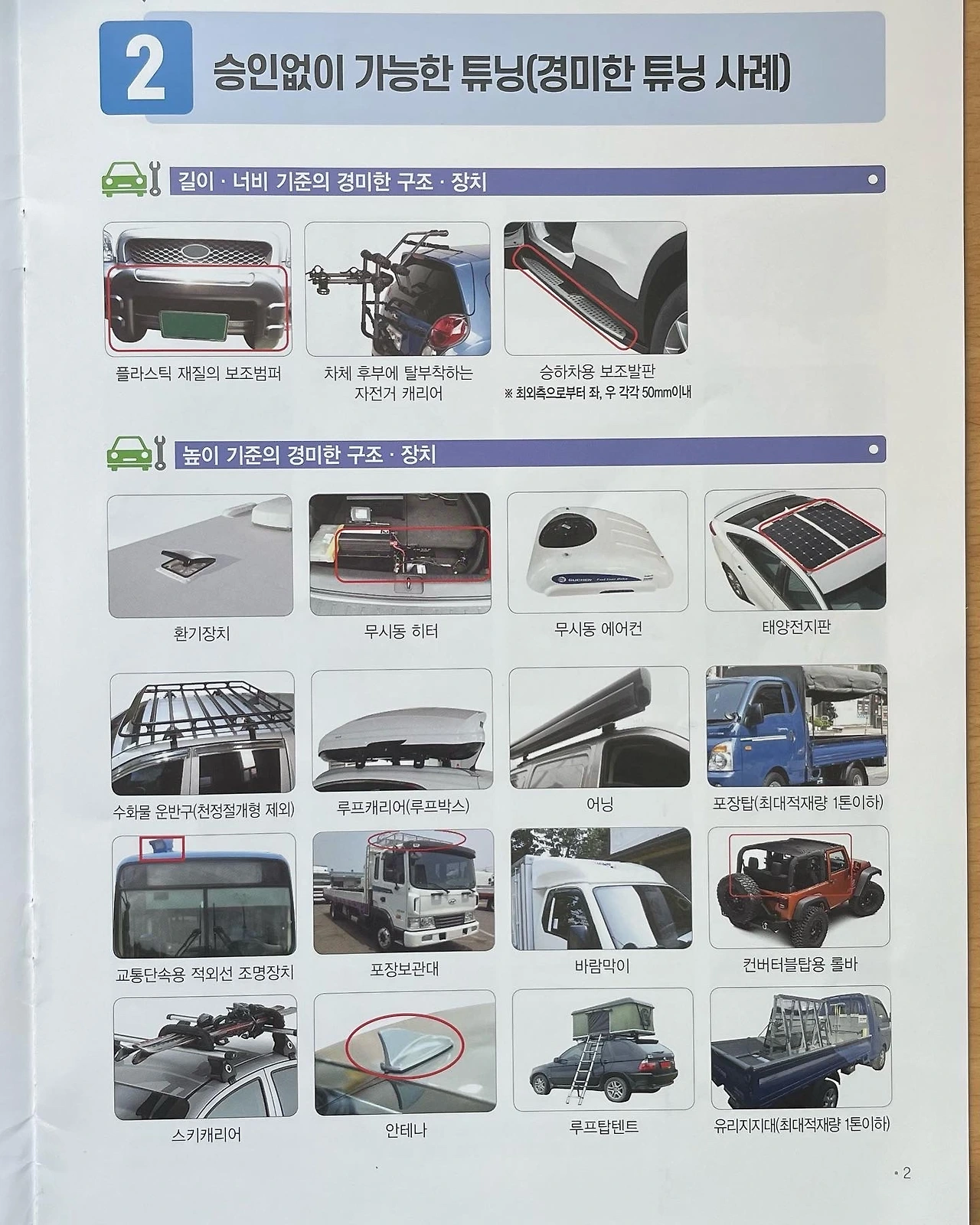 2번은 승인이 필요한 것들입니다. SUV를 오프로드용으로 개조할 때, 차고를 올리고 머드 타이어로 차폭이 넓어지게 될 때는 승인을 받으면 합법이 됩니다. 엔진을 변경하거나 인증받지 않은 머플러를 장착할 때도 마찬가지입니다.