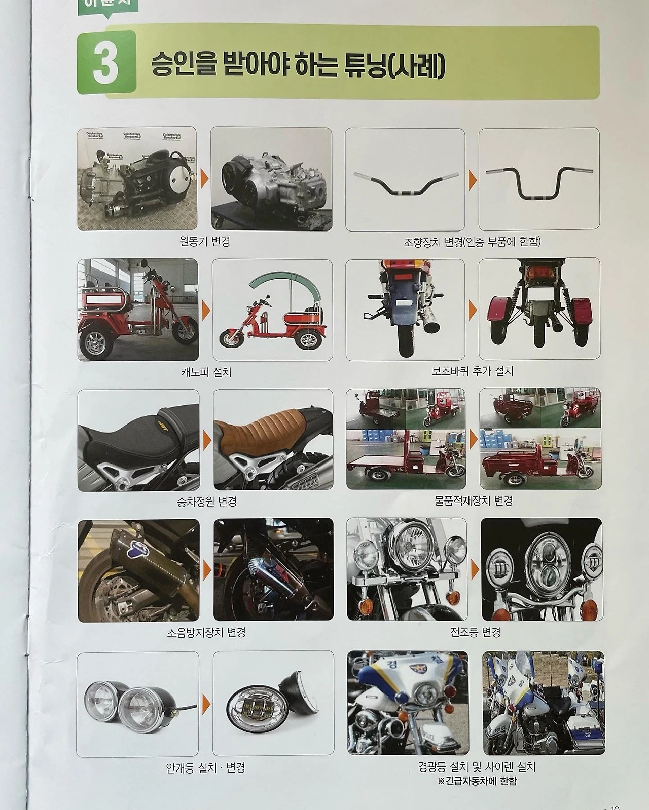 가장 많이 걸릴 수 있는 건 시트를 바꾸며 승차인원이 달라지는 경우나 핸들바를 바꾸는 것이 아닌가 싶습니다. 조향장치인 핸들바를 인증받은 부품에 한해 바꿔야 승인을 해준다는 건데… 과연 인증 부품이 있을까 모르겠네요.