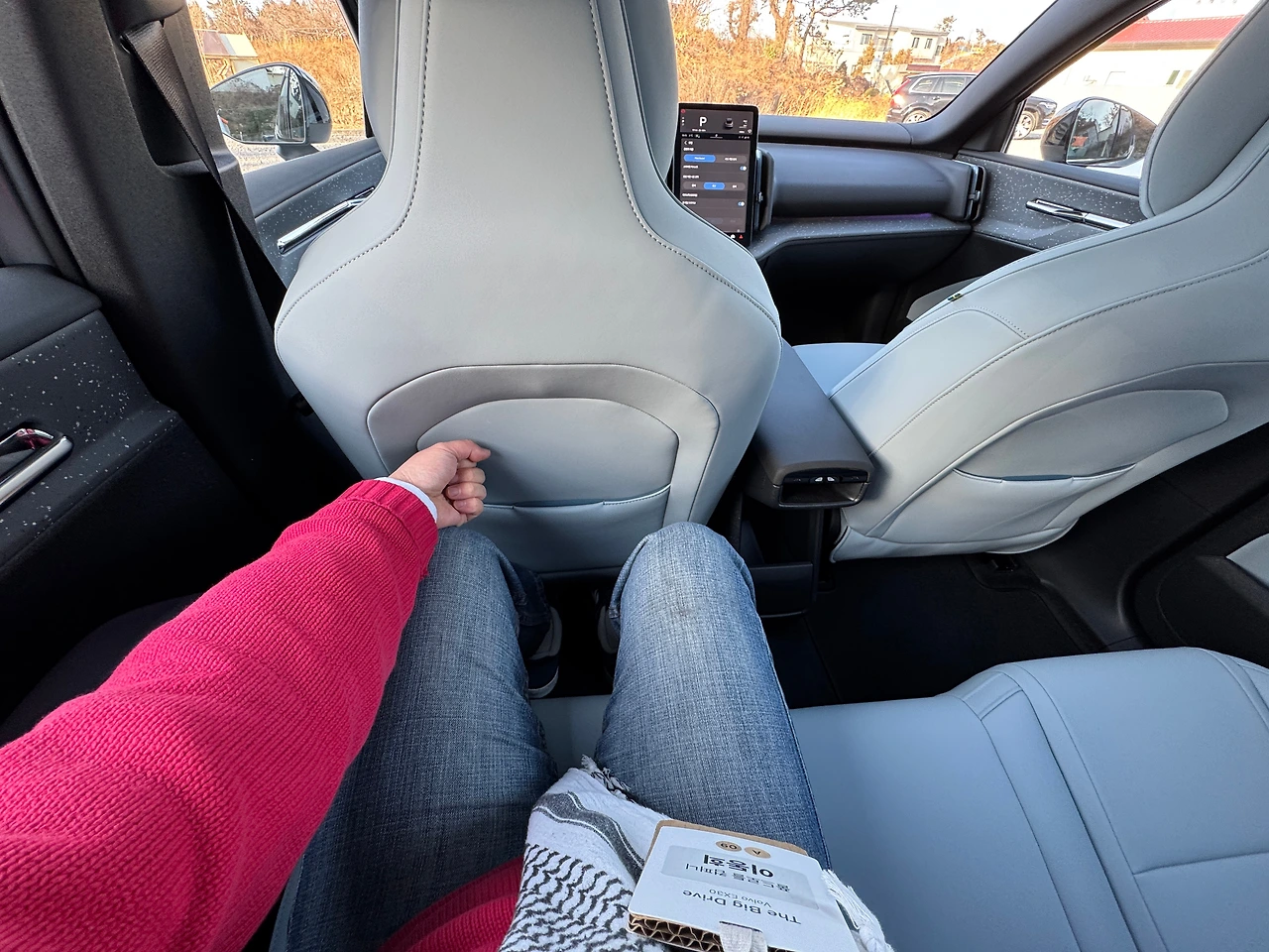 2열 공간은 ‘그럭저럭’입니다. 파노라마 루프가 있어 머리는 답답하지 않은데 다리는 좀 좁습니다. 상대적으로 트렁크 공간이 넓어 ‘1열에 어른 두 명이 타고 2열에는 큰 강아지를 태우면 가까워 좋겠다. 짐은 큰 트렁크에 넣고.’는 생각이 들었습니다. 반려견 동반하신 분들의 전시장 방문 이벤트도 좋겠고요.