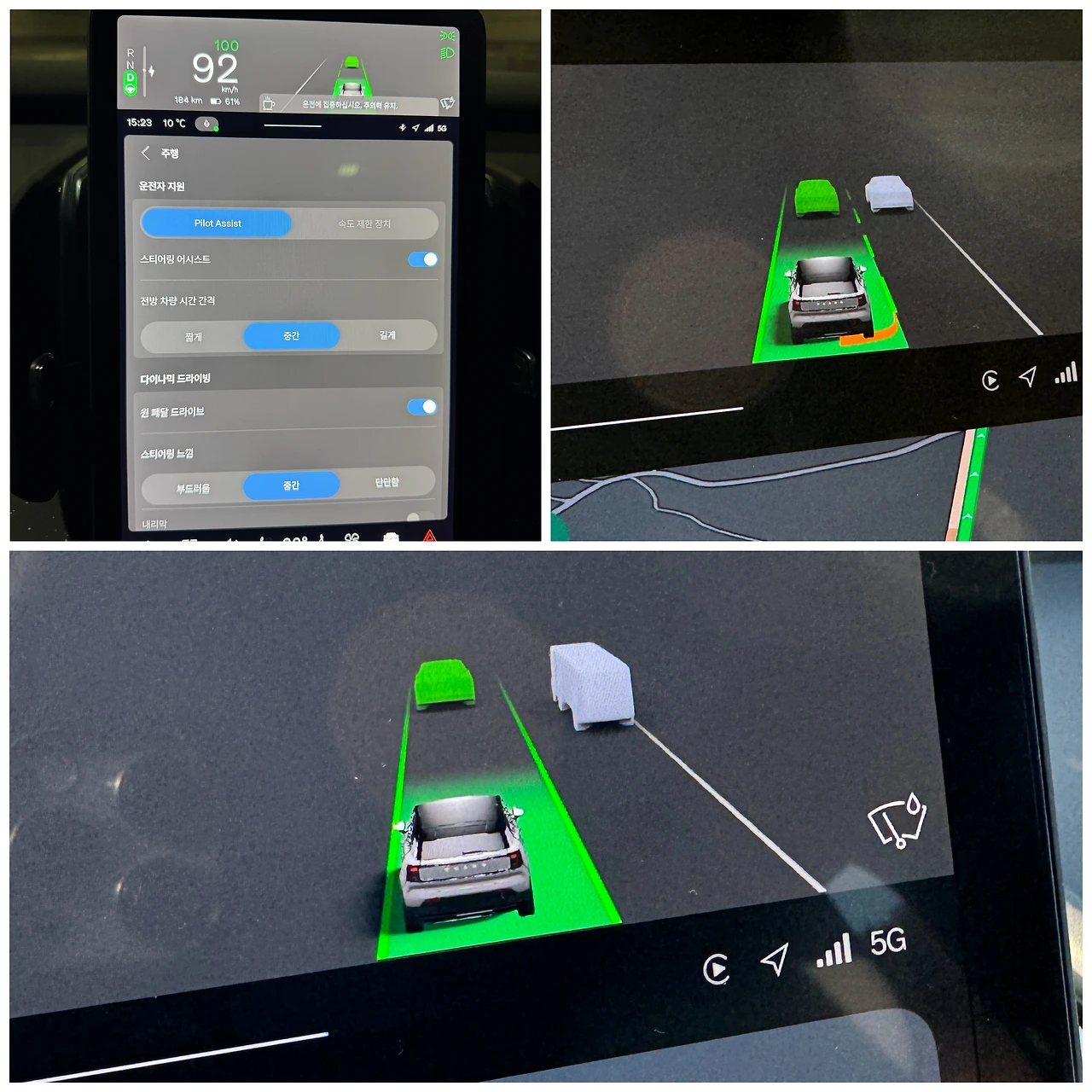 원래도 제어가 강한 편인 파일럿 어시스트는 조금 더 똑똑해졌습니다. 사진에 보이는 것처럼 좌우 차로의 차 크기에 따라 내 차로 안에서 편향 주행을 합니다. 이게 완전 새로운 기술은 아닌데 (현대차 그룹 HDA2도 됩니다), 한쪽으로 확실하게 붙고 저렇게 표시까지 해주니 좋더군요. 다만 시승을 하거나 출고할 때 고객들에게 확실히 알려주실 필요는 있습니다. ‘얘 왜 차가 한쪽으로 쏠려요?’가 될 수도 있으니까요.