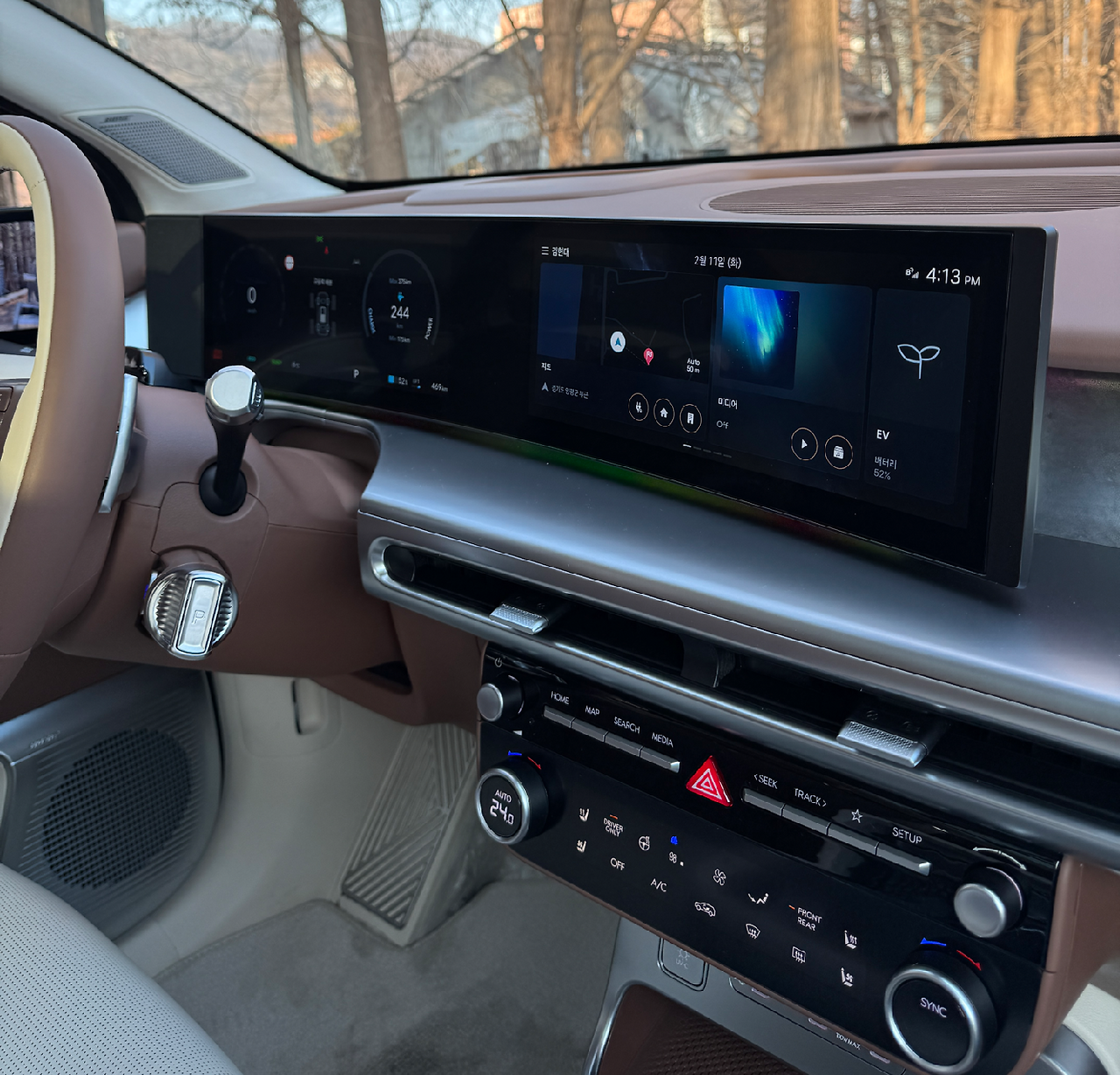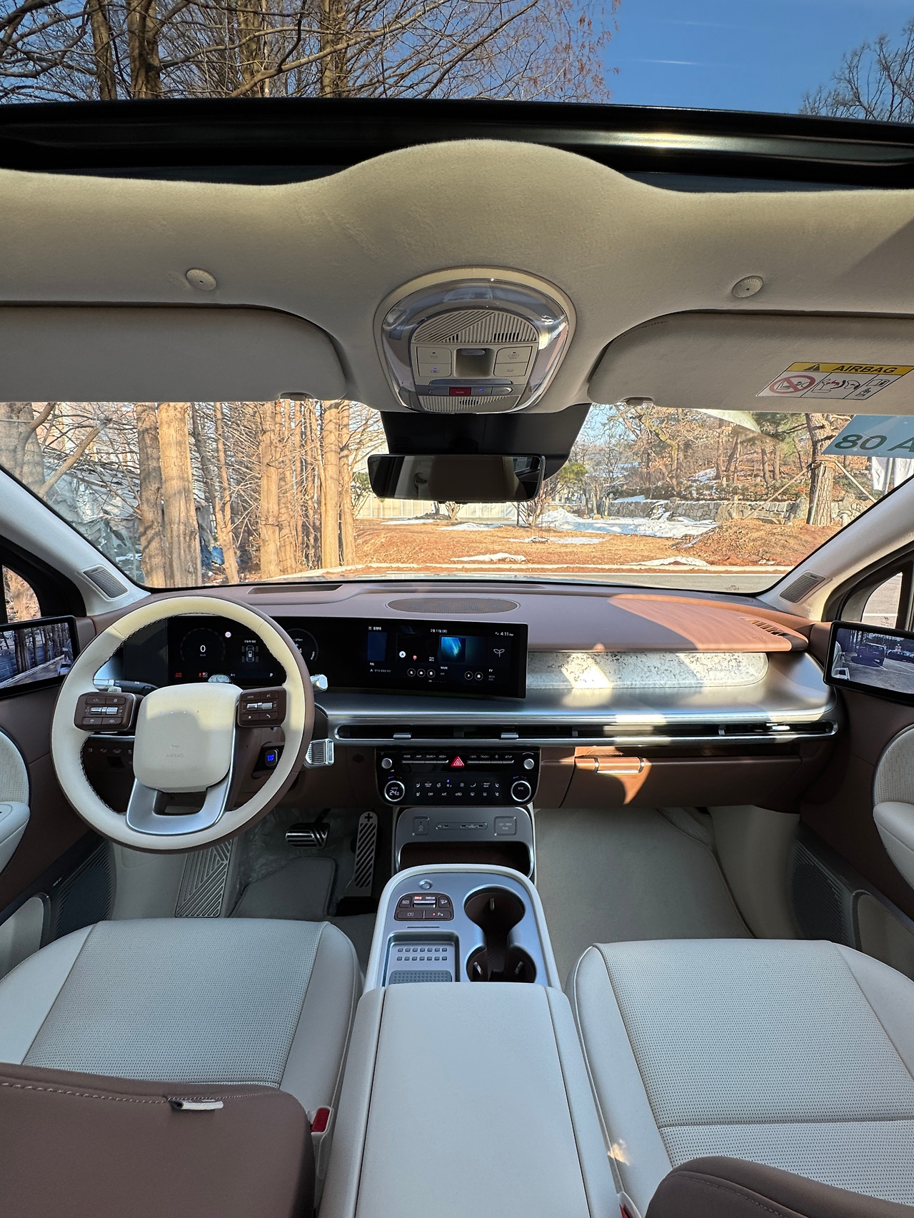 코냑 브라운/크리미 베이지 컬러의 실내는 화려합니다. 재질이 좋고 컬러 조합도 잘 어울립니다. 다만 친환경 소재들이 줄어든 (혹은 적극적으로 내세우지 않는) 건 아쉽습니다. ‘아이오닉’의 플래그십이라면 고급스럽게 만든 재활용 소재들을 더 적극적으로 쓰고 알려야 하지 않을까요. 최소한 나파가죽의 처리 방법에 대한 차이점이나 바이오 스웨이드 재질인 루프 라이닝처럼요.