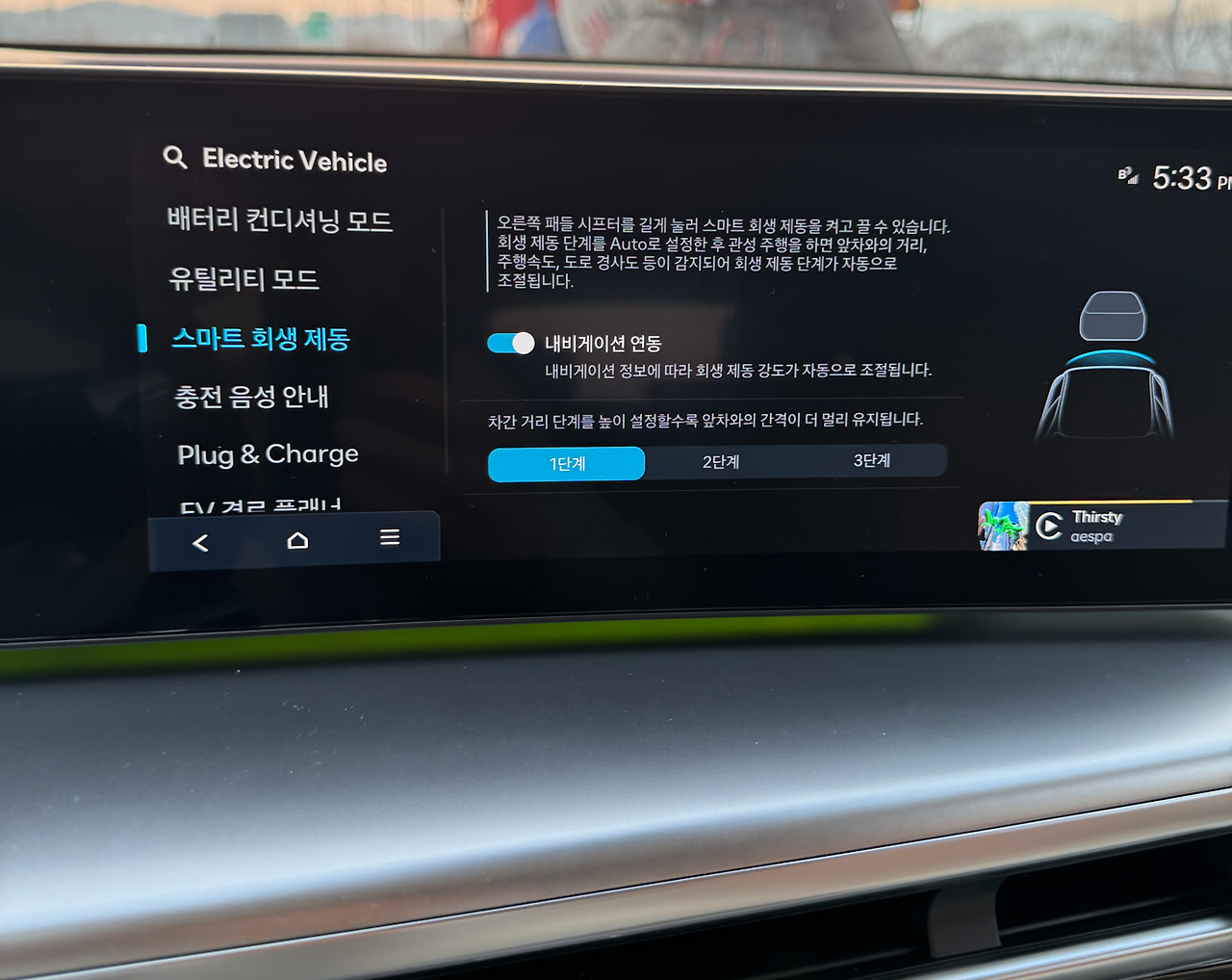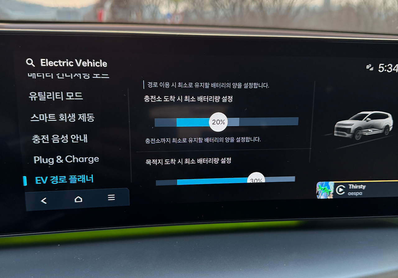 또 EV 경로 플래너도 똑똑해졌습니다. 목적지나 충전소 전까지 최소 배터리양 설정이 됩니다. 이러면 어디서 쉬며 얼마만큼을 충전할지를 미리 결정해 여정 자체가 편해집니다. 요즘 집(혹은 회사 등 주차시간이 긴 장소)에 완속충전기가 늘어나는 추세에 더 좋은 기능이기도 하고요.