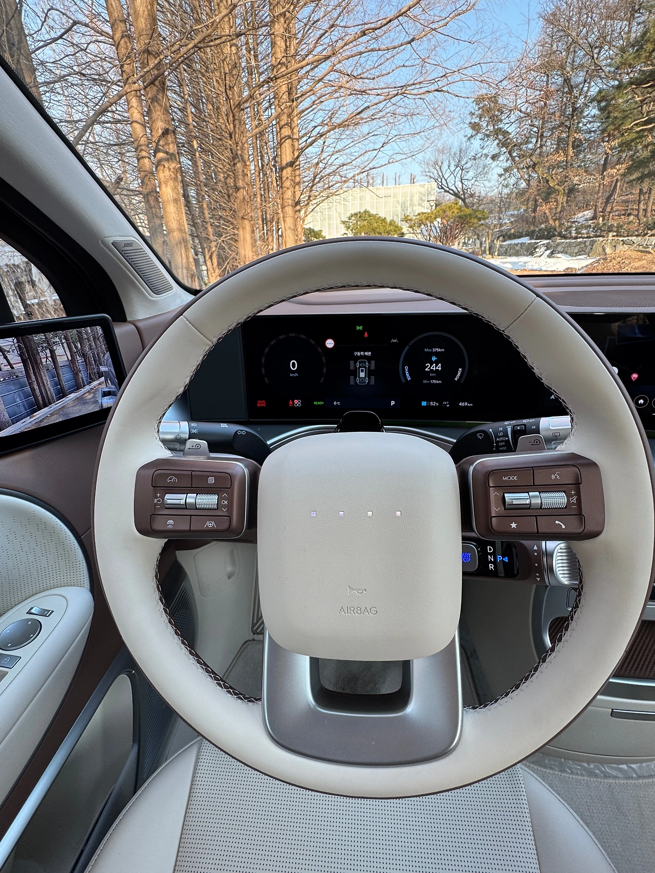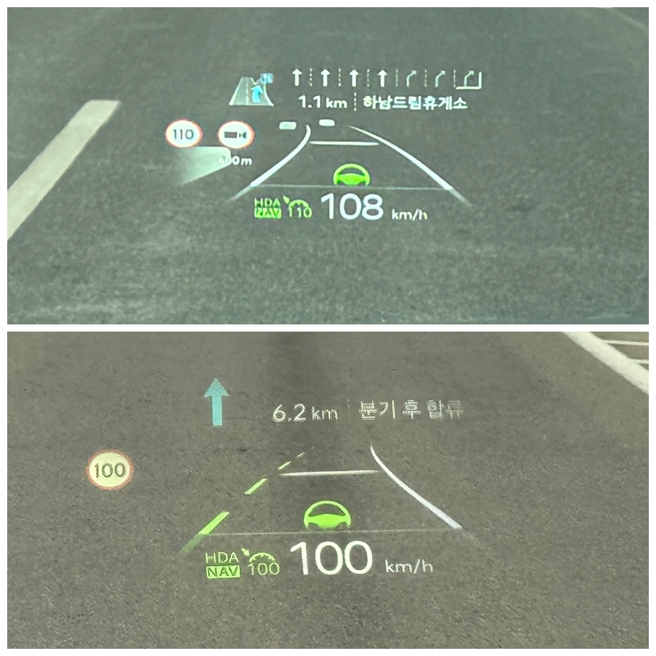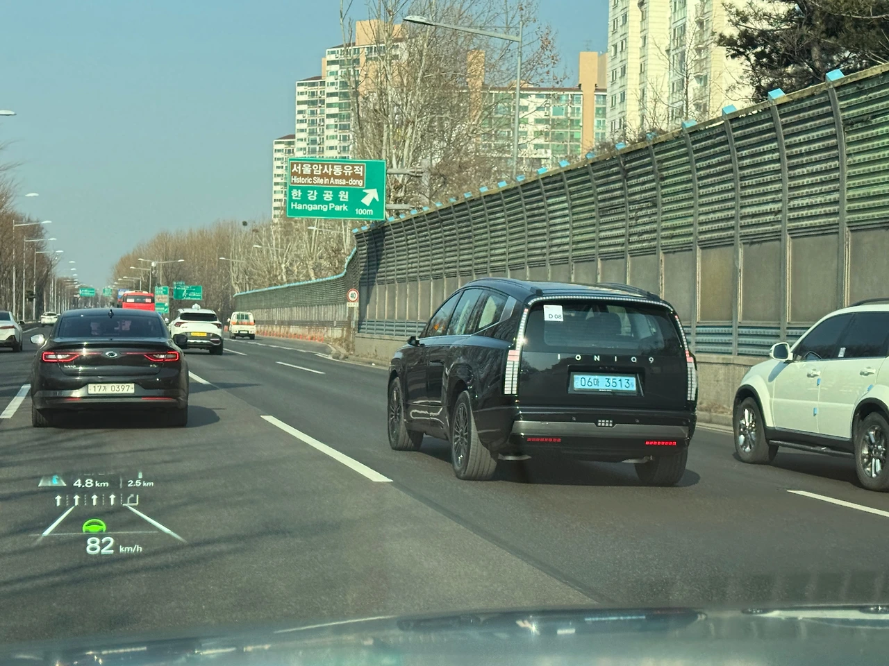 헤드업 디스플레이는 왜 카탈로그와, 또 직전 론칭한 팰리세이드보다 이전 버전이었을지 궁금합니다. 위쪽이 아이오닉 9, 아래가 팰리세이드입니다. 시승차들이 파일럿 생산 모델이라면 미리 알렸어야 하지 않나 싶고요. 아마 출고될 때 혹은 나중에 OTA로 업데이트가 되겠지요.
