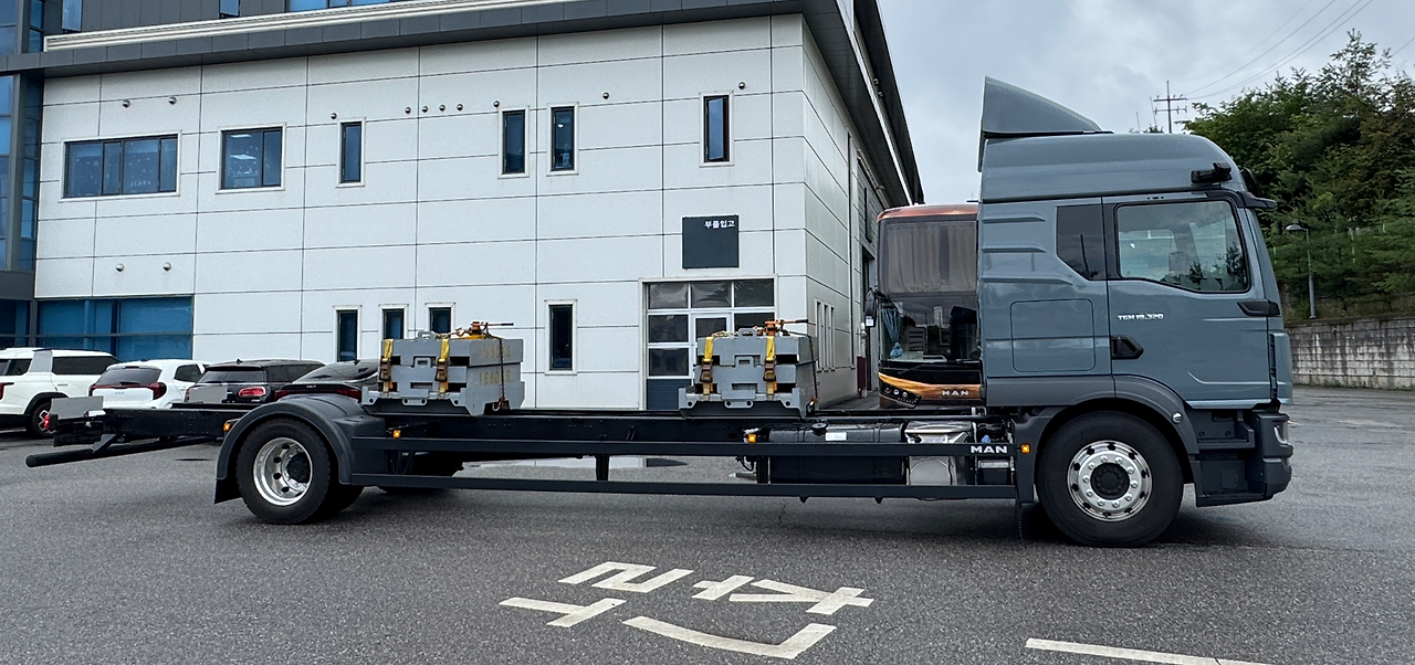 트럭 베드는 없으나 개당 1680kg인 추 4개와 브래킷까지 거의 8톤 가까이 실은 셈이었습니다. 덕분에 뒤쪽이 튀는 느낌이 적었는데, 휠베이스가 워낙 길어 뒤쪽으로 더 무게를 실어도 좋을 듯싶더군요.