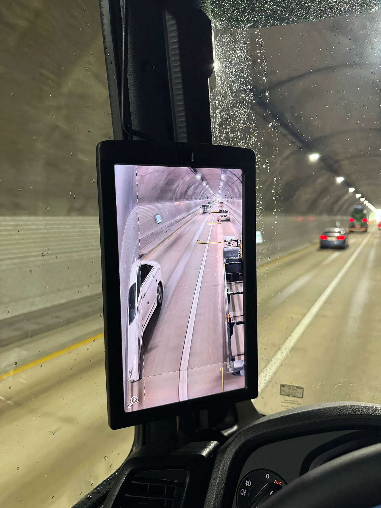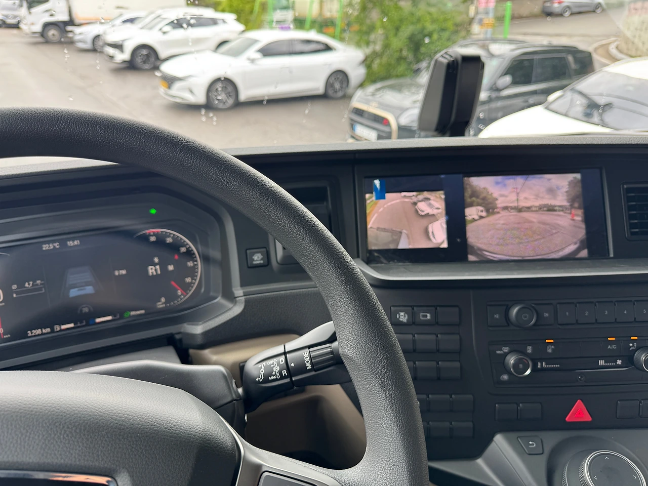 센터 모니터에는 전방과 후방 영상이 표시되어 사각이 많은 트럭을 보완합니다.