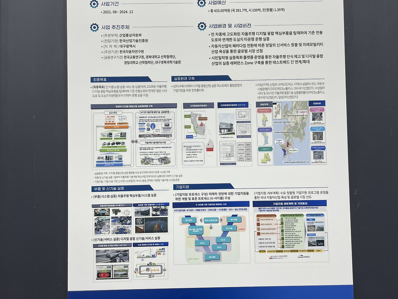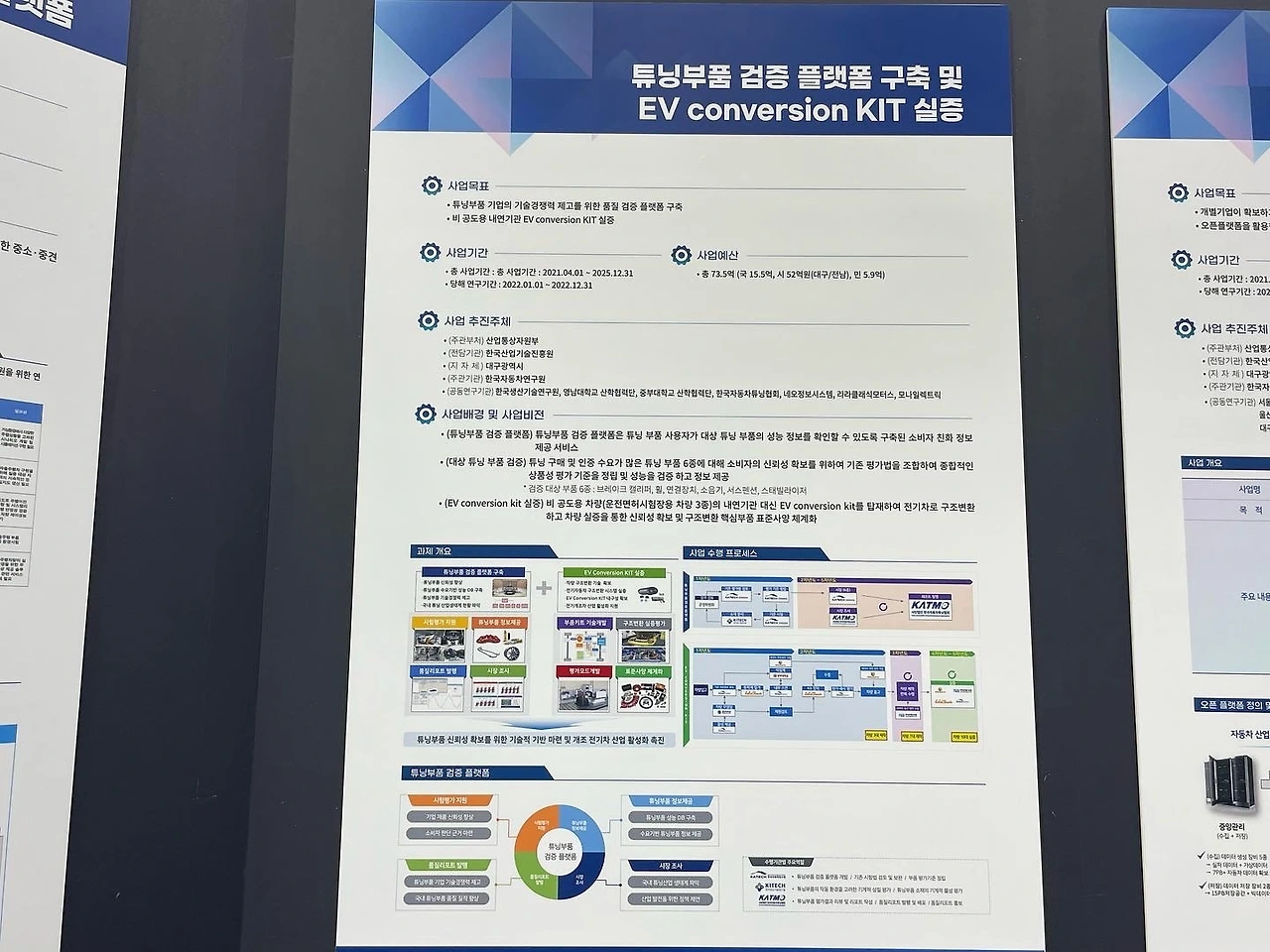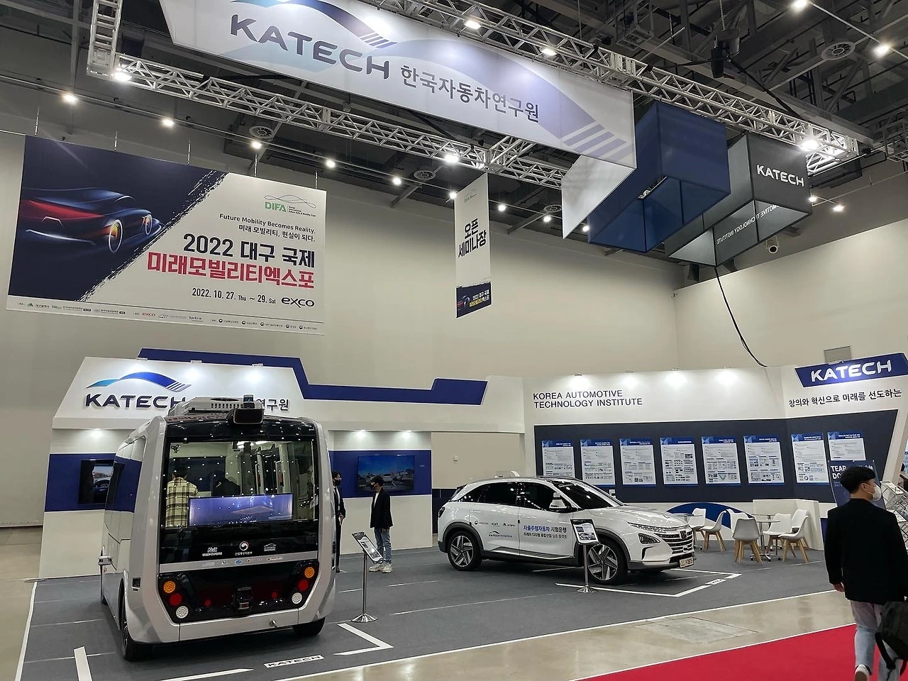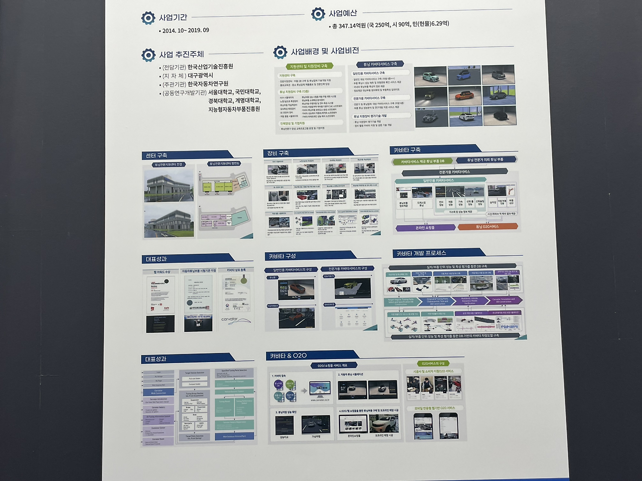 자동차와 관련된 여러 연구 기관 중, 한국자동차 연구원(KATECH)의 부스입니다. 대구경북본부에서 연구 중인 자율주행차를 전시했는데, 특히 벽에 붙은 사업 소개 포스터들이 꼼꼼하게 읽어볼 내용들이 많았습니다.