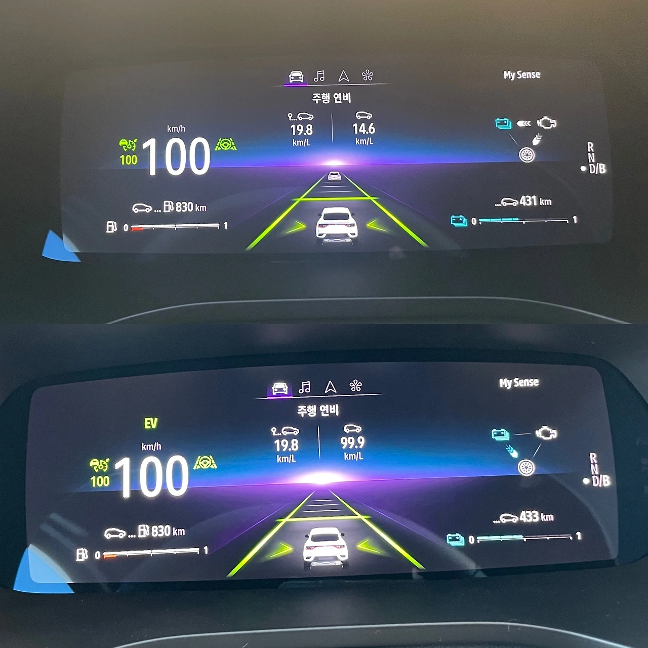 이 사진에서 보이듯 EV 모드 선택도 가능하고, 기어레버를 B에 놓으면 회생제동이 강해지는데 이것도 이질감이 크지 않습니다.