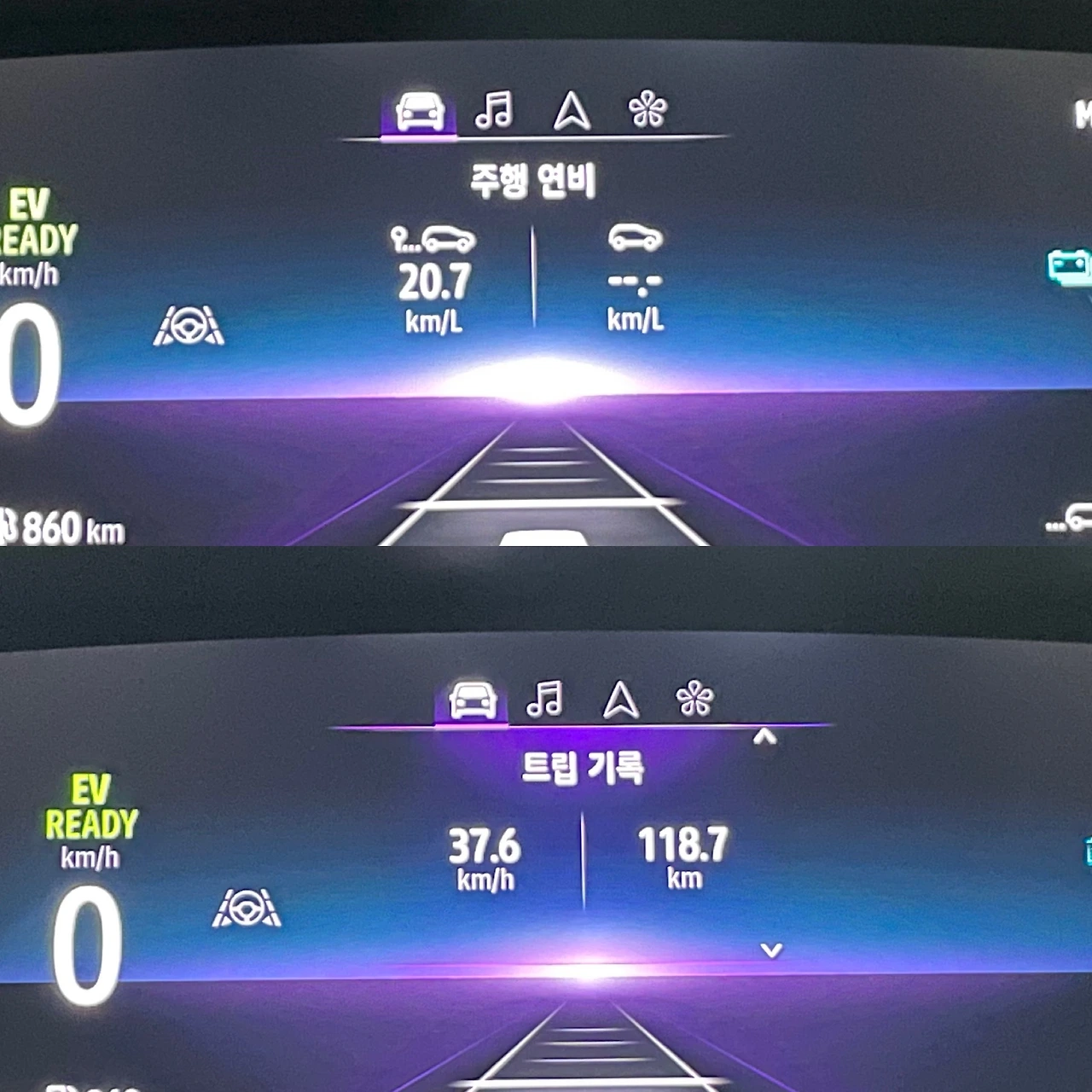 실제 주행 결과 사진입니다. 118.7km를 평균속도 37.6km/h로 달렸으니 느리지도 빠르지도 않은 일상 달리기입니다. 이 상태에서 평균 연비는 20.7km/L로 18인치 기준 공인 복합연비가 17.0km/L보다 훨씬 좋게 나왔습니다. 평균 연비 왼쪽 아래에 ‘860’이라는 숫자가 보이실 겁니다. 50L 연료탱크를 가득 채우고 저만큼 달린 후에 남은 주행 가능 거리입니다. 한번 주유로 1,000km 주행이 가능하겠더군요.
