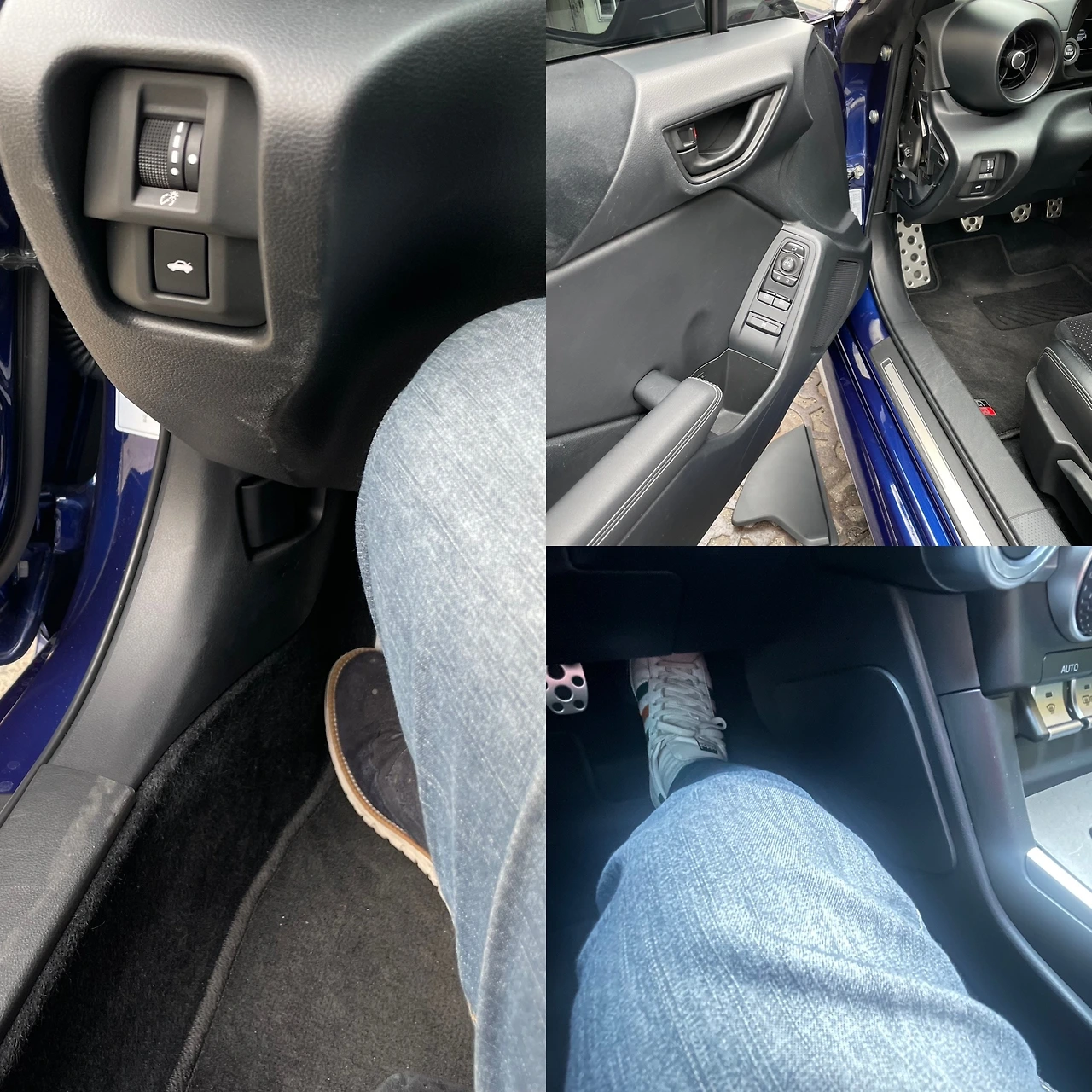 실내에서는 좋은 점과 불편한 점이 공존합니다. 운전대 왼쪽 아래, 헤드라이트 높이 조절 및 트렁크 스위치 부분이 튀어나와 있는데 이게 내릴 때 오른쪽 무릎이 부딪칩니다. 결국 바깥쪽 내장재가 툭 떨어지더군요. 저만 그런 게 아니라는 건 거기 생긴 흠집을 봐도 알 수 있지요. 반면 오른쪽 센터콘솔 옆에는 얇은 패드가 있어 코너링 중 오른발을 고정하기 좋습니다.
