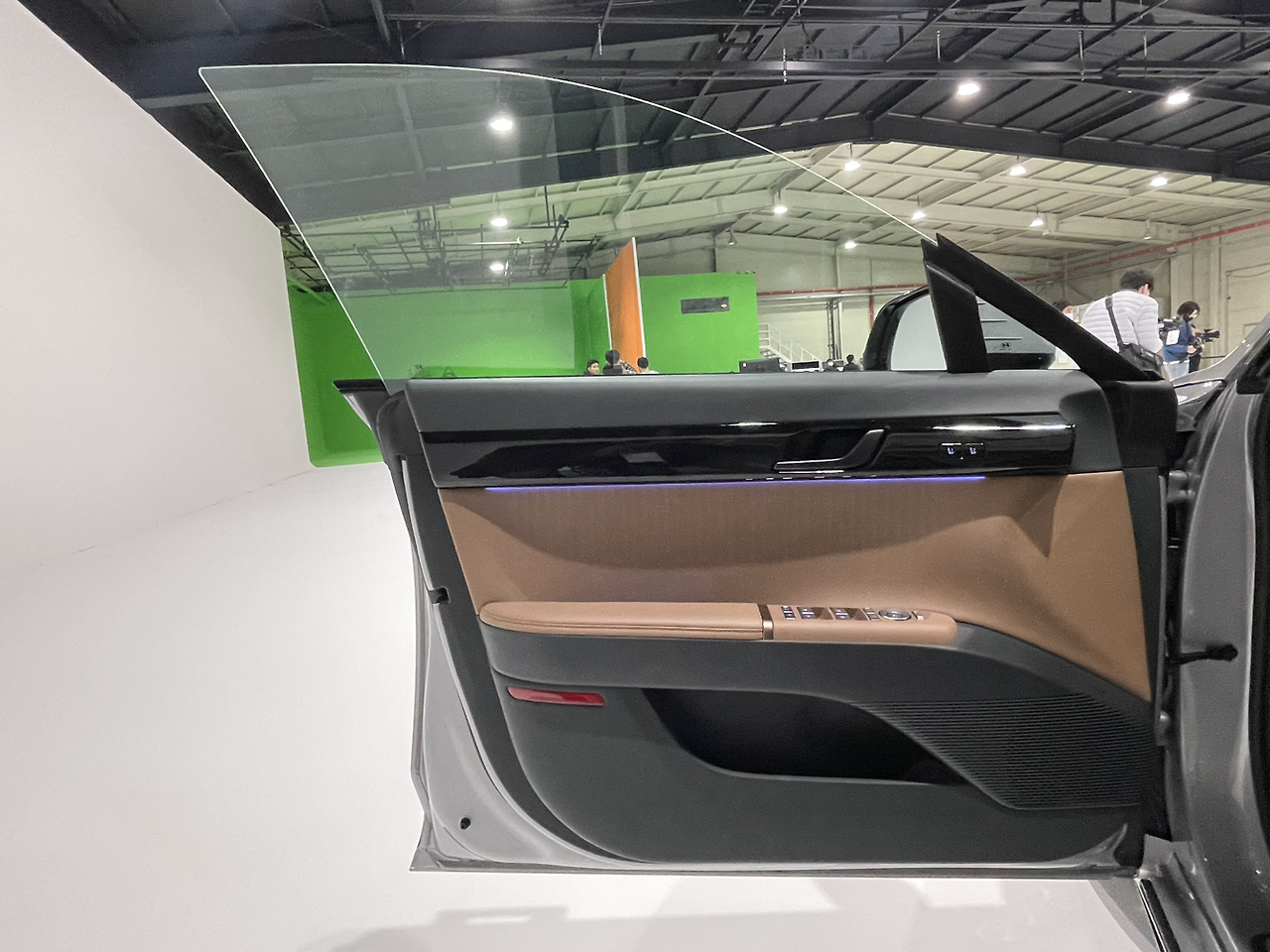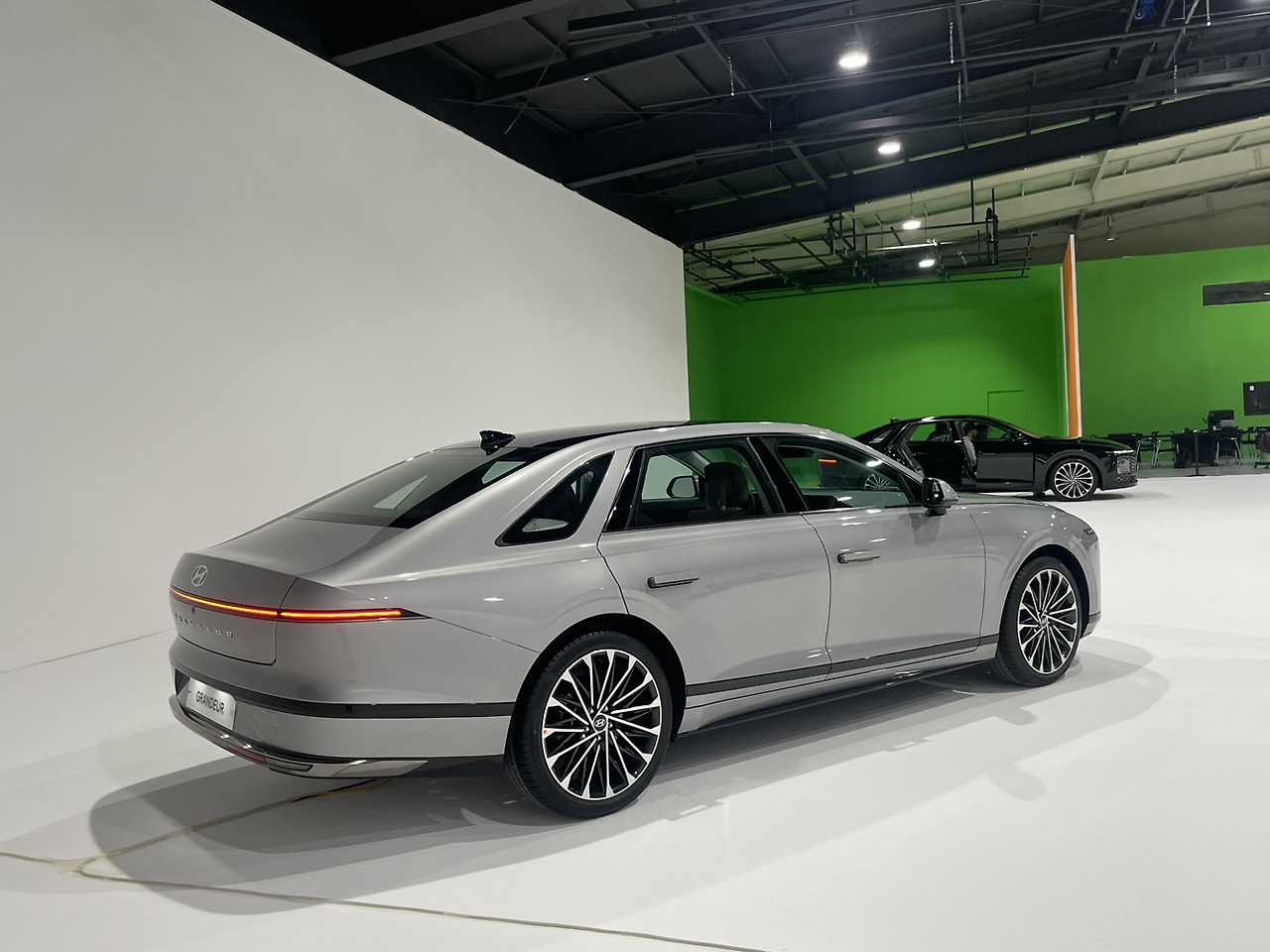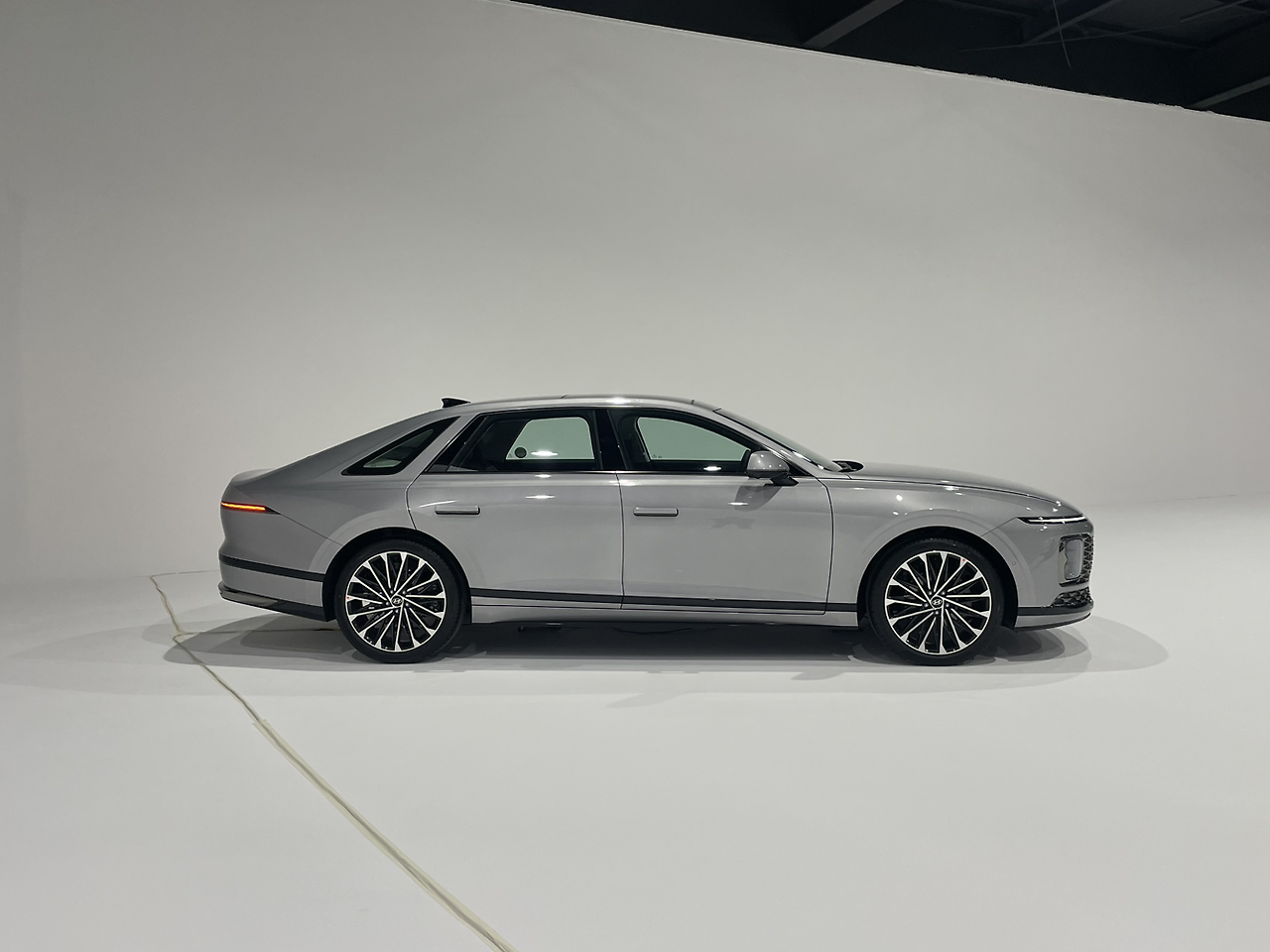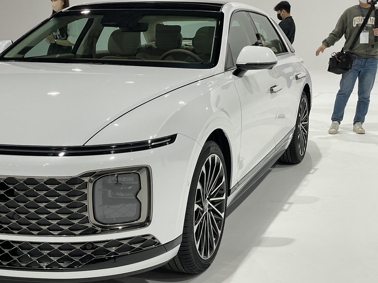 차 길이가 5m를 넘고 직선 디자인 덕에 더 커 보입니다. 그래도 밸런스가 좋아 부담스럽지는 않네요. 스튜디오라 도로에서 어떻게 보일지가 궁금하긴 합니다. 전면부의 심리스 호라이즌 램프가 과거 넥쏘부터 최근 스타리아까지 본 것이라 익숙한데, 세단 보디에 처음 쓰였음에도 괜찮습니다. 앞뒤 펜더가 꽤 부풀어 있어 볼륨감도 크고요. 20인치 휠이 어색하지 않습니다.