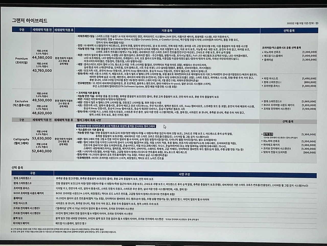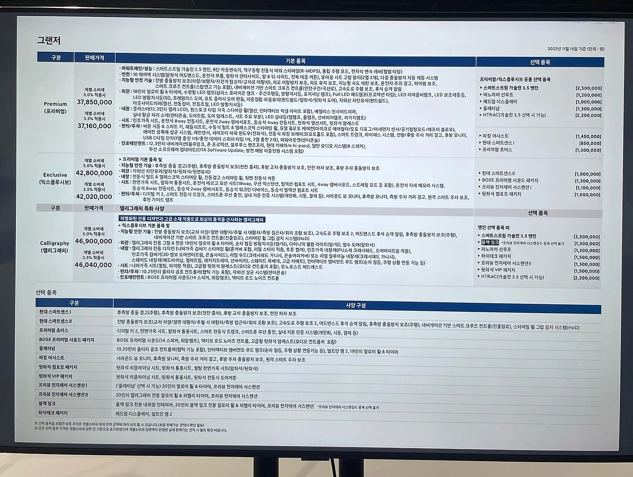 가격표들을 올렸는데요, 전시된 차는 2.5L 캘리그래피(4604만)+ 파노라마 선루프(120만)+ 하이테크 패키지(150만)+ 프리뷰 전자제어 서스펜션II(130만)+ 뒷좌석 VIP 팩(150만)이 더해진 5510만 원입니다. 여기에는 리얼 우드 인테리어도 포함됩니다.