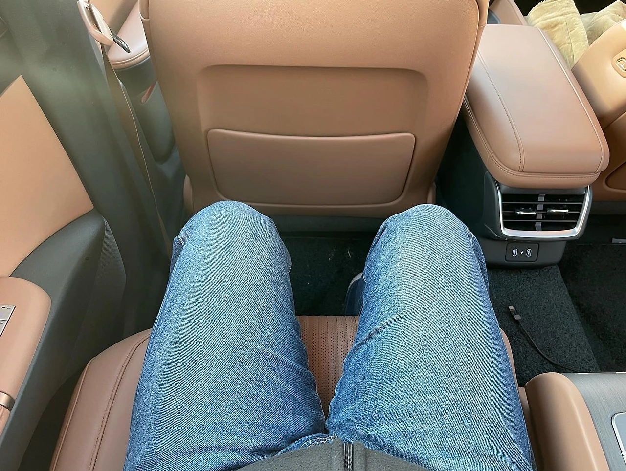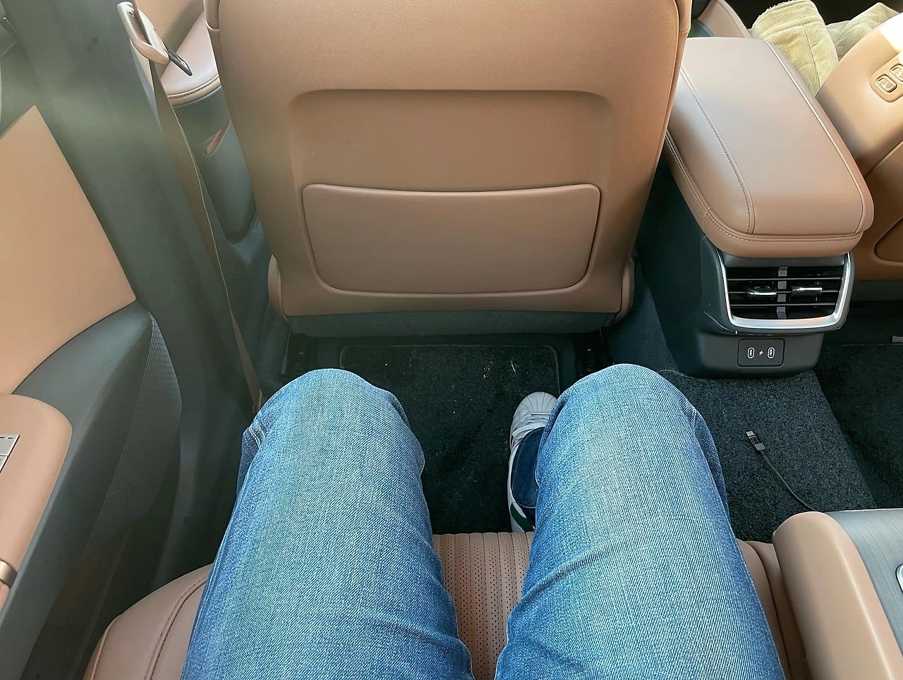 뒷좌석 VIP 패키지가 있어 2열에도 앉아 봤습니다. 시트가 좀 높다는 생각은 여전합니다. 제가 앉았을 때 천장과는 주먹 하나 정도 공간이 남으니 여유가 크진 않은 것 같습니다. 시트를 레스트(REST) 모드로 바꾸면 엉덩이 쿠션이 앞으로 밀려나며 등받이가 눕는 방식인데, 높은 엉덩이 쿠션 때문에 느긋하게 기대어 편하게 발을 앞으로 길게 뻗는다는 느낌이 작습니다. 생각보다 편하다고 느껴지진 않더군요. 흐음.