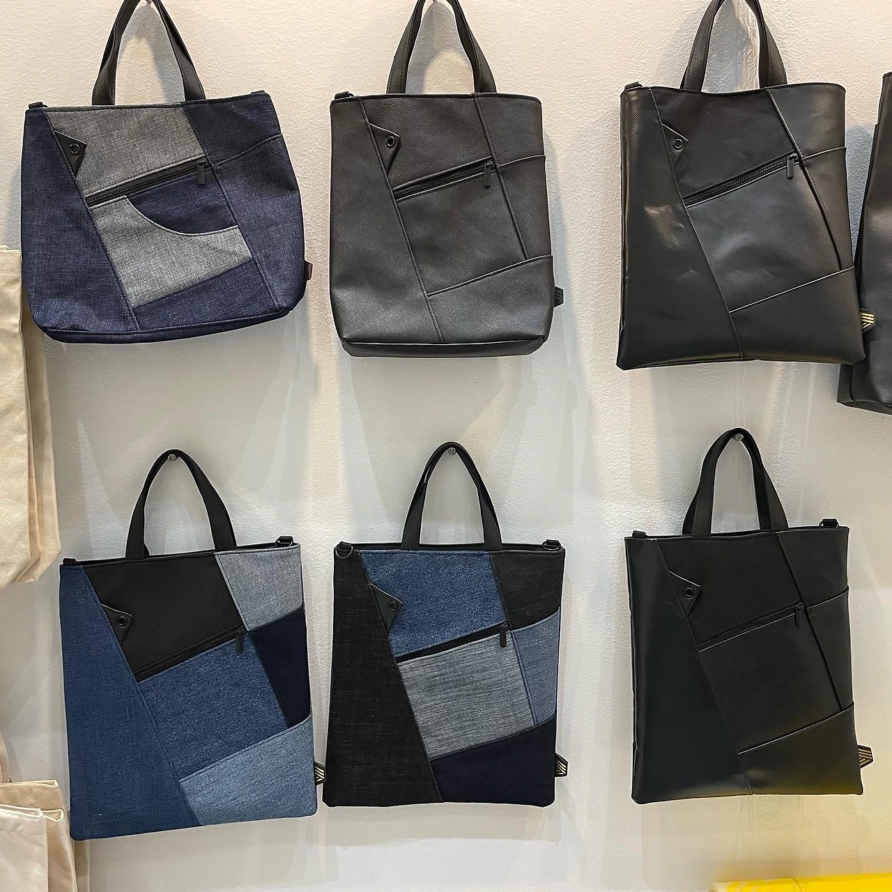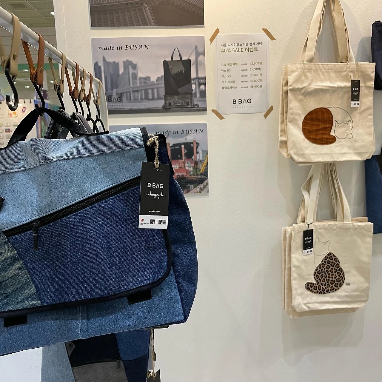 아홉, 열 번째는 부산의 B Bag이라는 업체입니다. 사회적 기업으로 경력단절 여성들에게 재봉 기술을 가르치고 재고 의류를 활용해 가방으로 만드는 곳입니다. 제품 중 하나가 <레드닷> 디자인상을 수상했다더군요. 여러 가지 진을 이용한 직소 디자인 가방들을 선보였는데요, 특히 다양한 톤과 재질의 블루진으로 만든 가방들이 예쁘더군요.