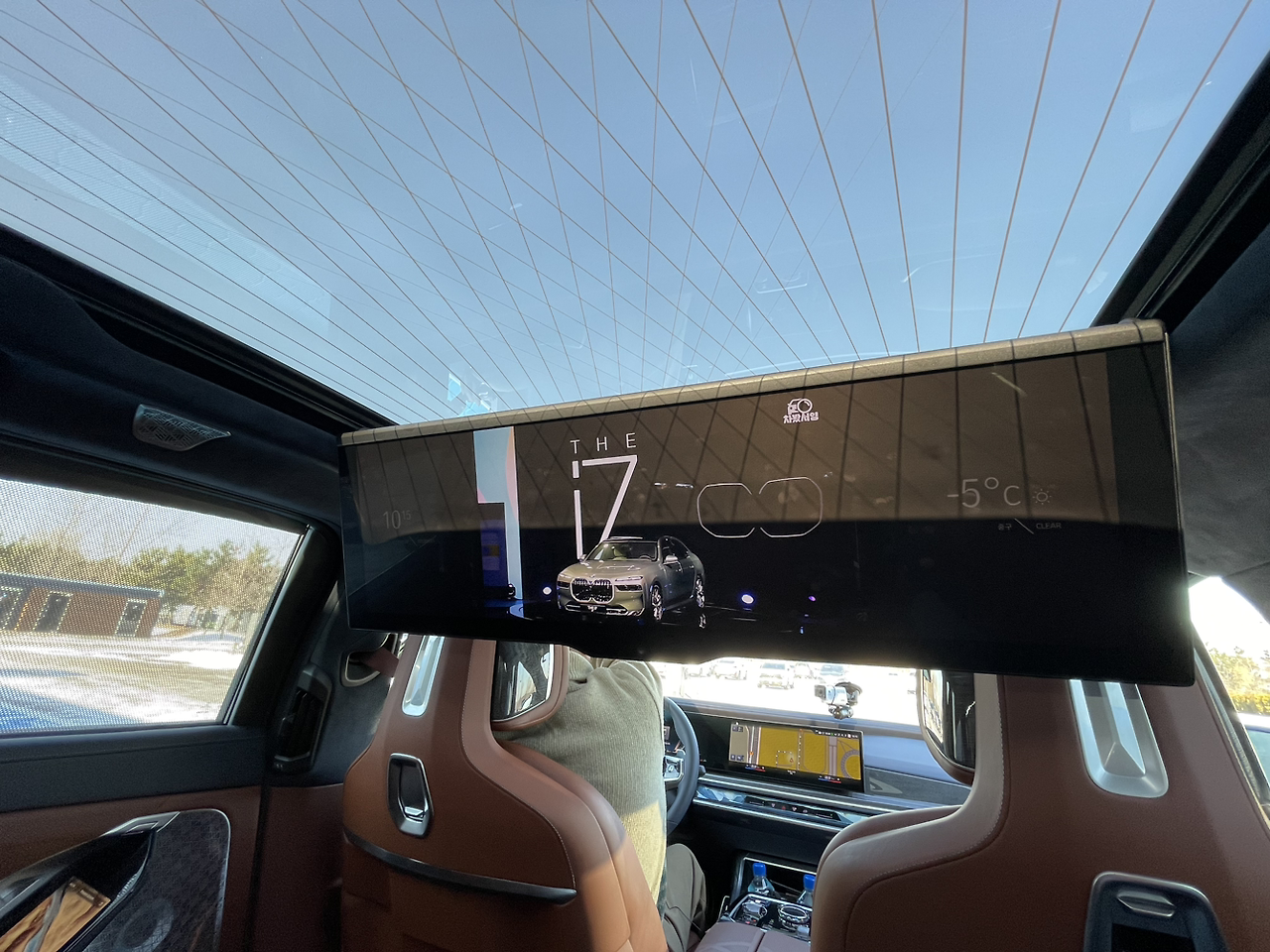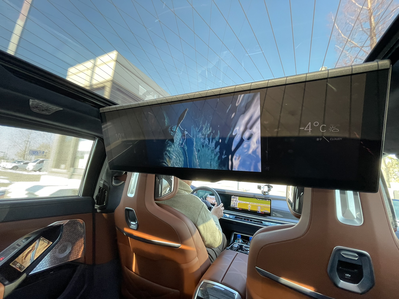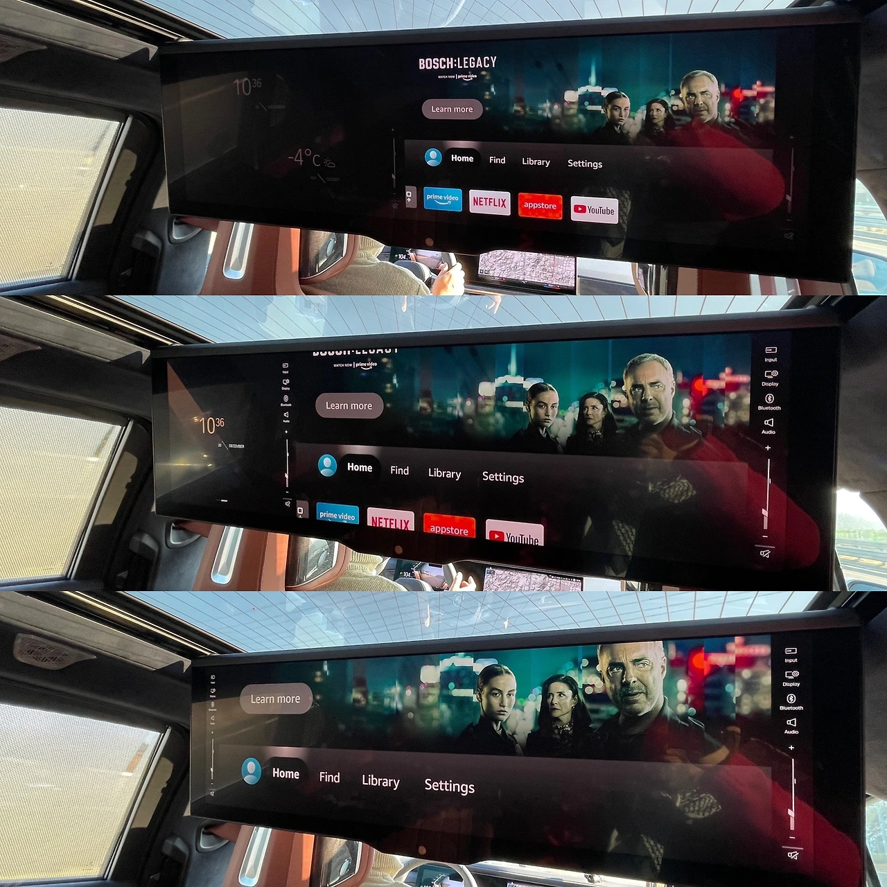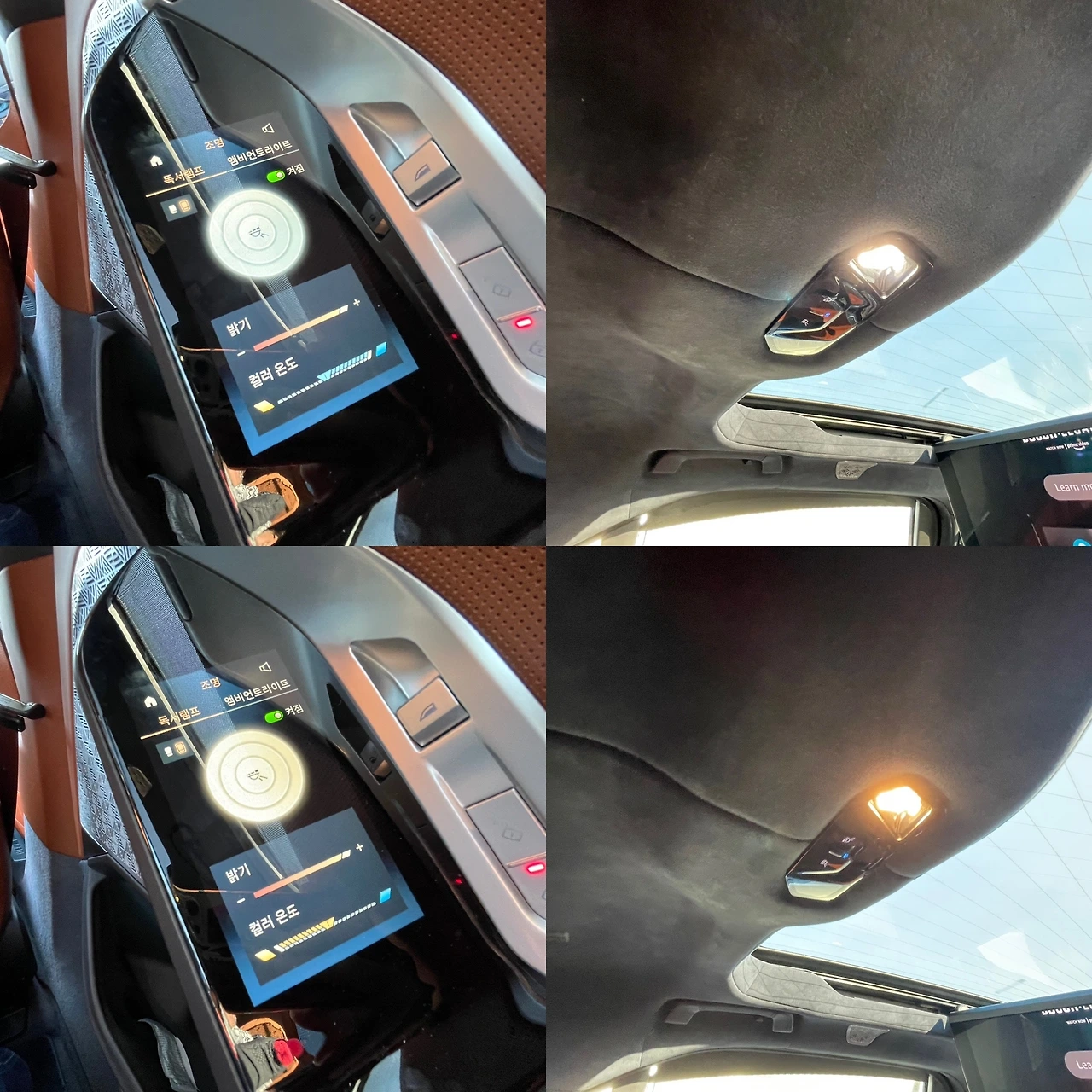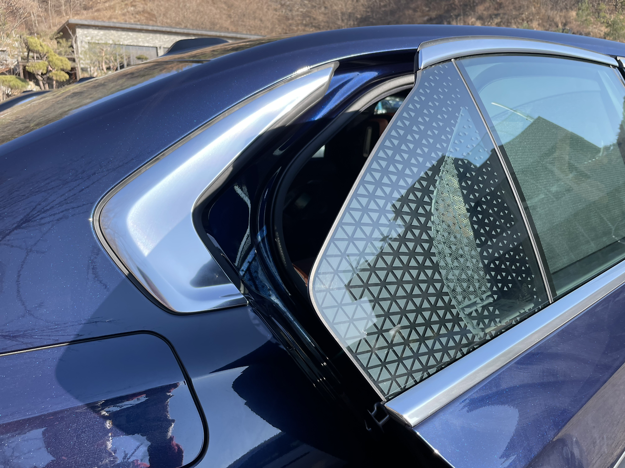 시어터 스크린은 여러 효과를 냅니다. 무엇보다 운전석과의 분리입니다. 예전 리무진에 있던 격벽이 생각날 정도입니다. 기본적으로 두툼한 뒷유리 스크린과 함께 룸미러로 차 뒤 상황 확인이 어렵습니다. 역시나 전문 드라이버를 믿고 뒷자리의 분리해 프라이버시를 더 중요하게 생각한 것이지요. 위 사진처럼 햇볕을 받아도 매우 선명합니다. 와이드 스크린 비율에 맞는 콘텐츠만 제공된다면 좋겠습니다. ‘탈태’는 이렇게 과거에서 벗어난 것으로 완성됩니다.