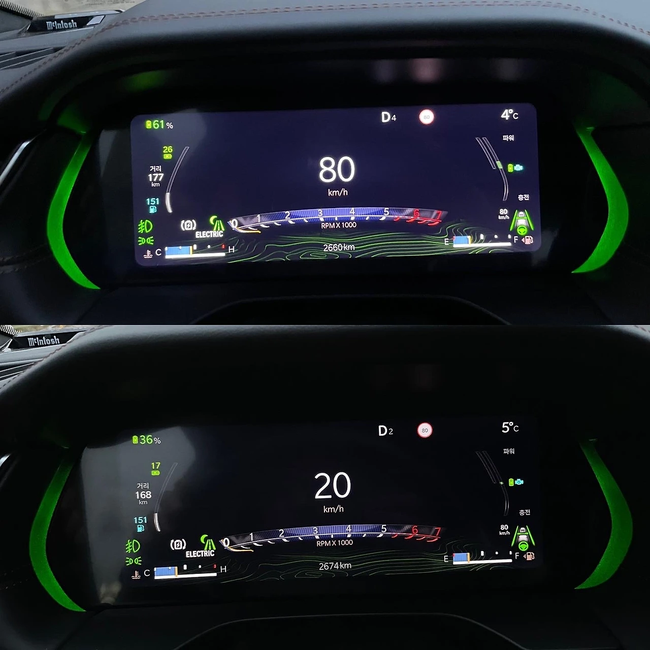 EV 모드에서도 힘이 충분해 흐름을 따라가는 것은 전혀 문제가 없는데 이게 엔진-모터-변속기 구조를 적극적으로 활용한 덕분입니다. 사진에도 있는데, 같은 EV 모드라도 20km/h에서는 기어 2단, 80km/h에서는 기어 4단이 표시됩니다. 그러니까 EV 모드에서 8단 변속기를 적극적으로 쓰는 거죠. 매우 자연스럽습니다.