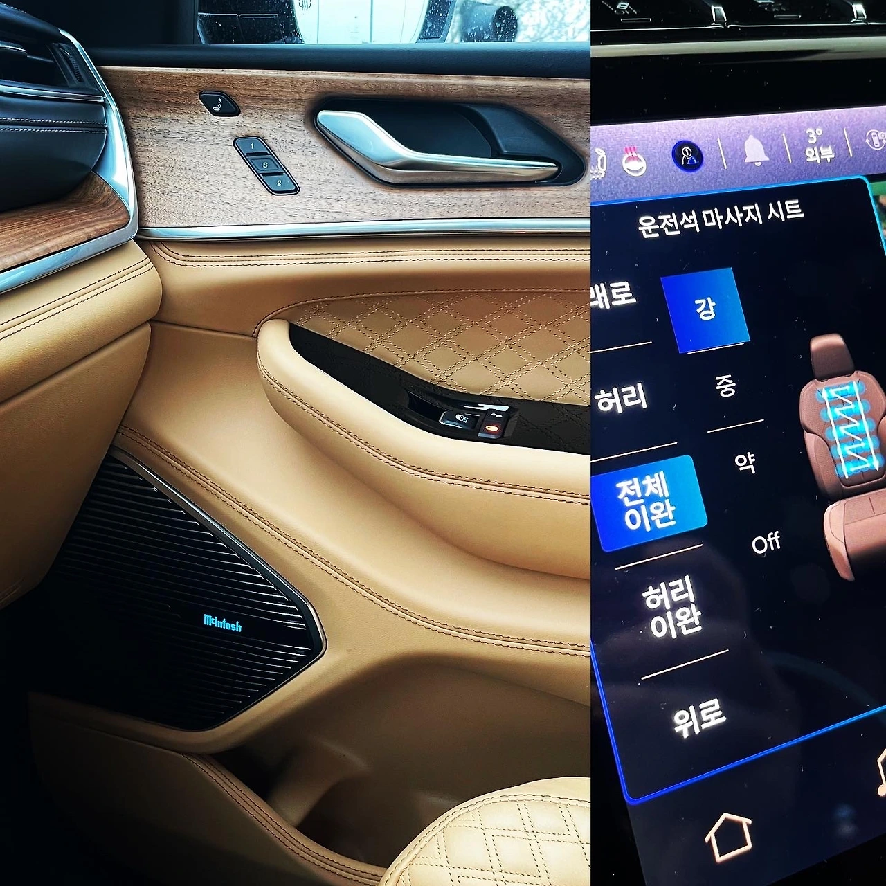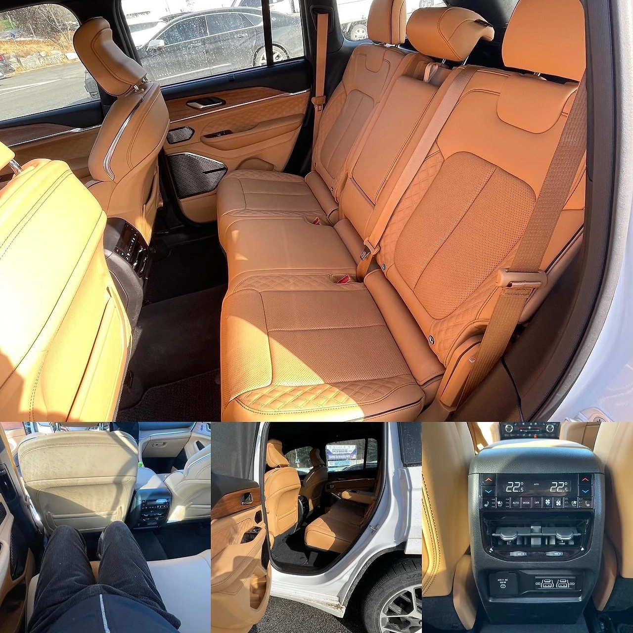 무엇보다 실내가 완전 좋습니다. 나뭇결이 살아 있는 오픈포어 리얼 우드나 가죽 시트의 질감, 컬러가 과거에 비해서도 혹은 다른 프리미엄 브랜드 차들과 비교해도 좋습니다. 보는 사람들마다 ‘지프가 이 정도라고?’는 말이 나왔을 정도니까요. 당연히 기능도 많습니다. 앞좌석 안마 기능이 꽤 강하고 프로그램도 다양합니다.