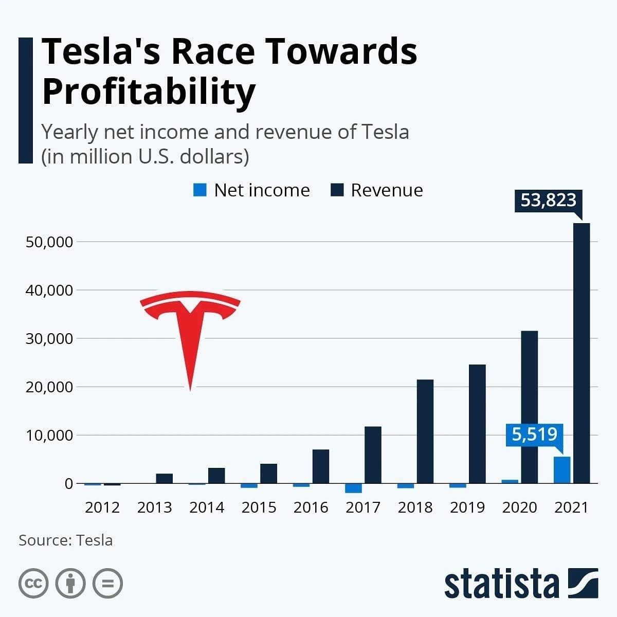 테슬라의 매출과 수익에 대해 정리한 그래프가 있어서 가져왔습니다. 2020년에 처음으로 수익을 냈고, 2021년에는 카본 크레딧을 제외하고도 수익 창출에 성공했군요.