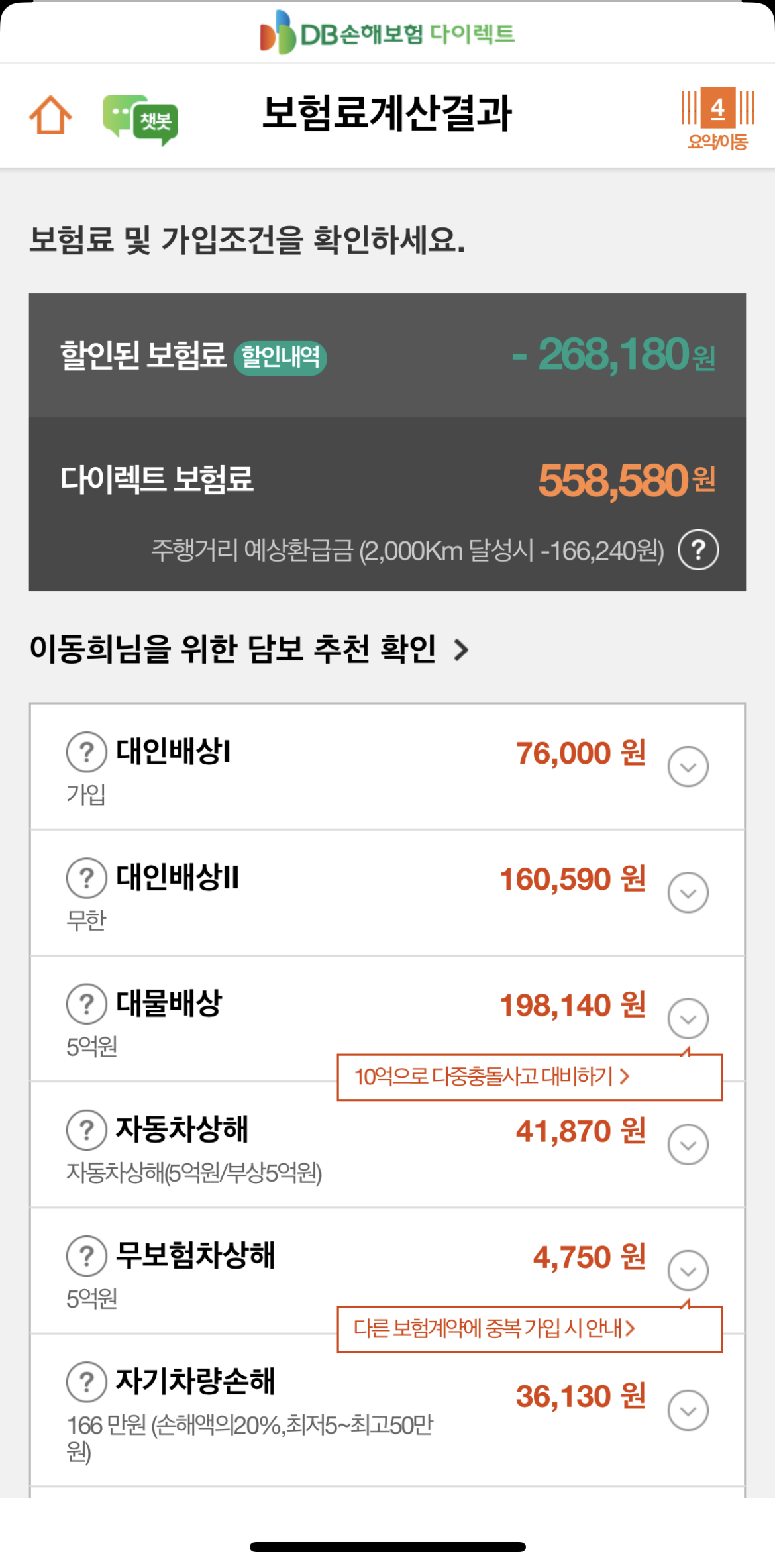 결국 DB 손해보험 다이렉트로 가입했습니다. 저 금액이 절대적이지는 않습니다. 전 1인 한정이고 견인도 50km까지로 연장하는 등 여러 조건들이 다르니까요.