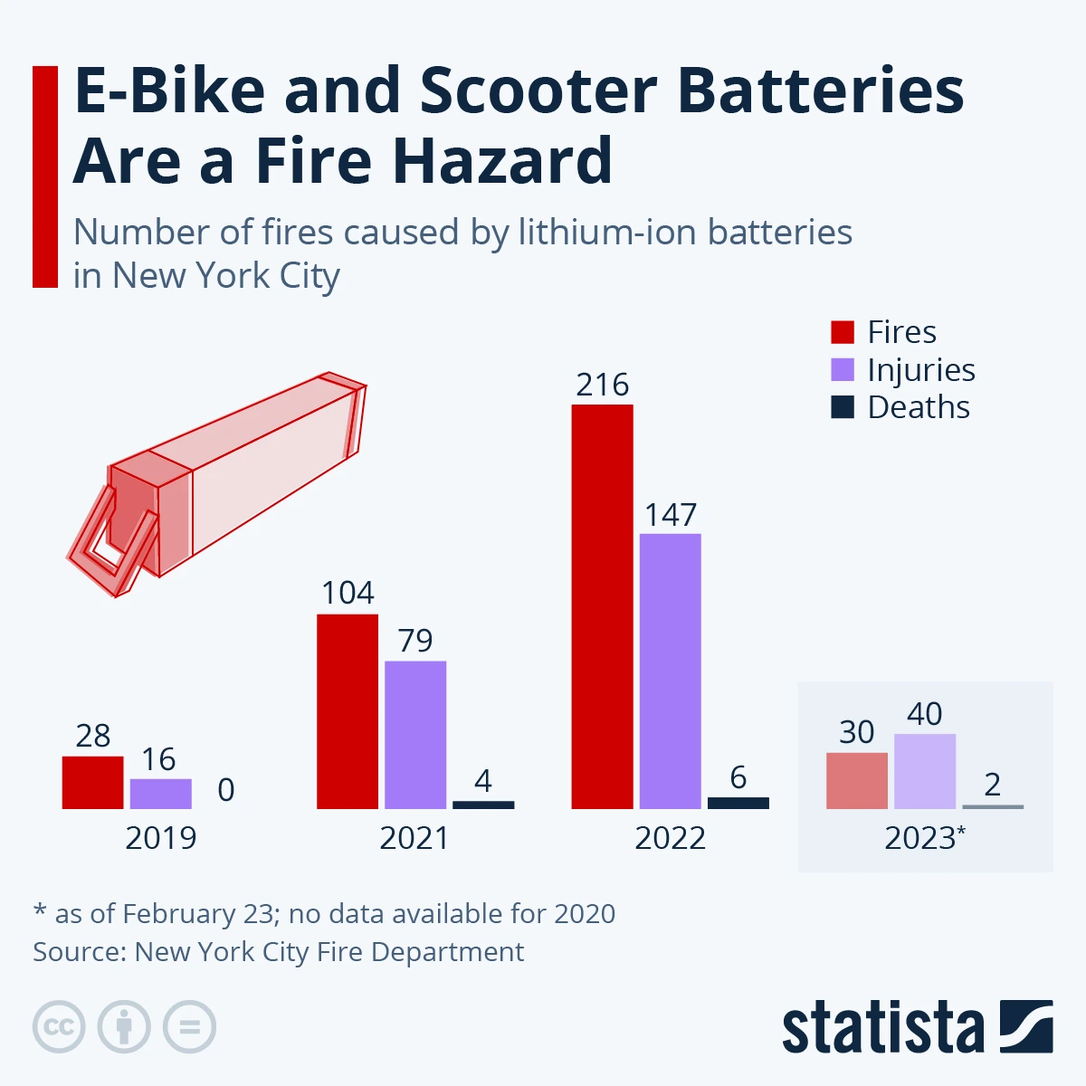 미국 뉴욕시에서 발생한, 전동 스쿠터와 자전거의 리튬-이온 배터리 화재 발생 횟수와 부상/사망자 숫자의 통계. 종류가 다양해져 판매가 늘어나니 화재 발생 빈도도 함께 증가했다는 통계입니다. 얼마 전에는 실제로 큰 화재로 이어졌던 모양입니다.