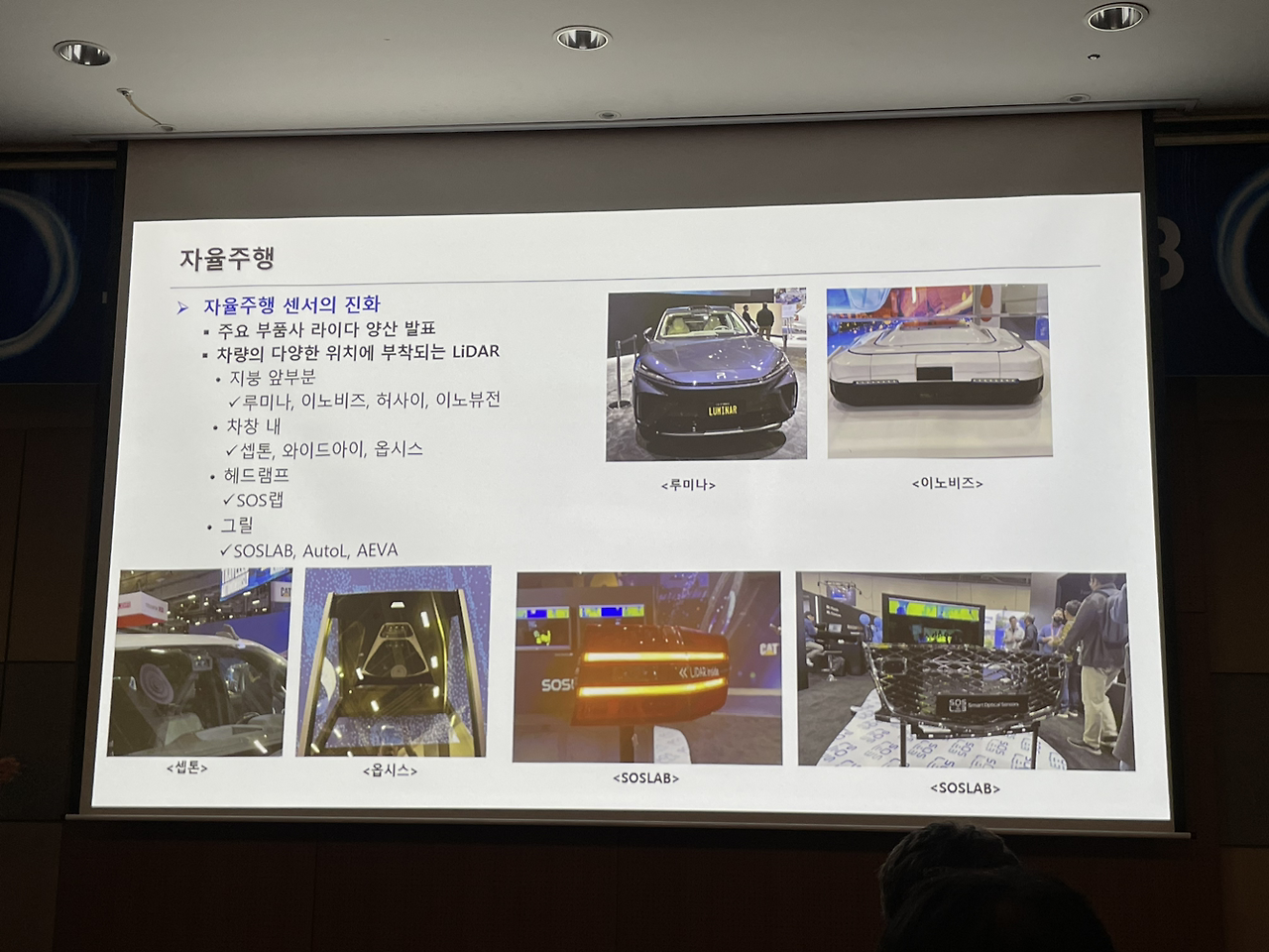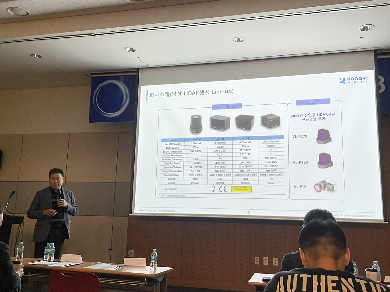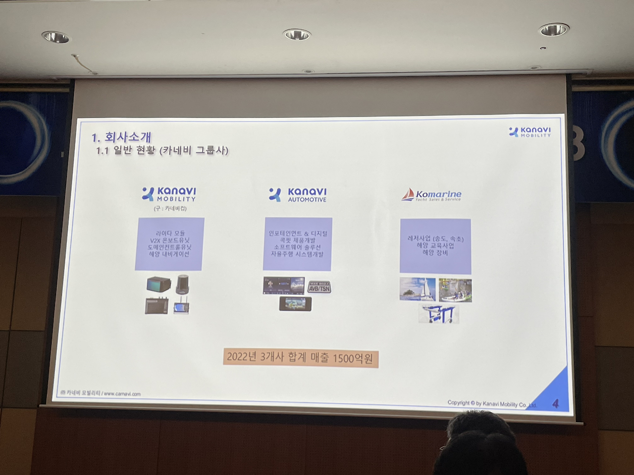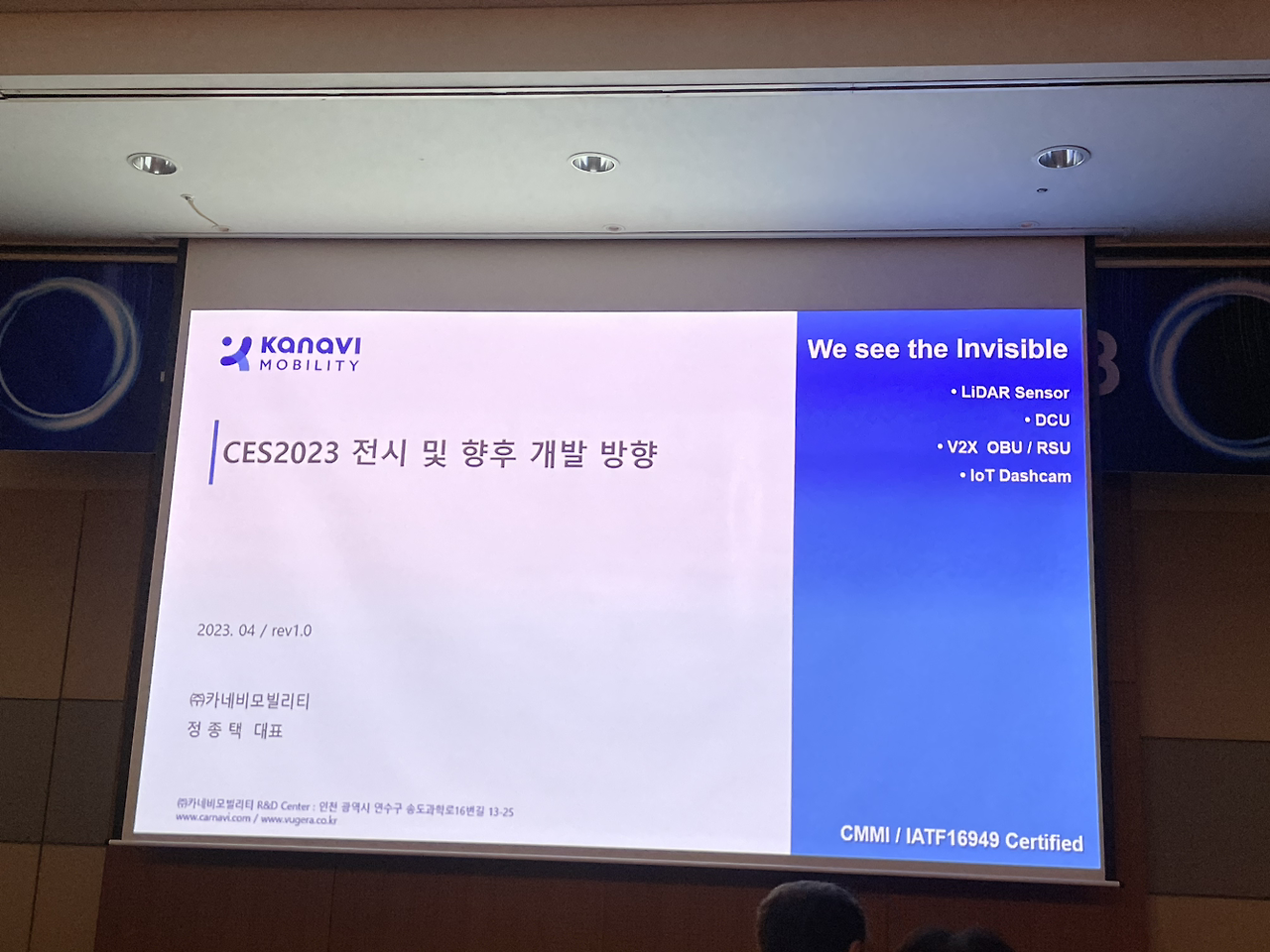 첫 발표는 카네비컴 정종택 회장이었습니다. 국내에는 블랙박스나 내비게이션 모듈 회사로 알려져 있고 저도 그렇게 알고 있었습니다. 근데 라이다, 특히 해양에서 쓰이는 제품군을 포함해 소프트웨어까지 굉장히 다양한 영역에서 활동하시더군요. 관련된 영역에서 회사가 오래 되고 경험이 많아 고생하는 발표자 회사등에게 대한민국이 감사해야 한다는 말씀을 하시더군요. 매우 인상 깊은 발표였습니다. V2X가 상용화되면 하이패스 단말기처럼 많은 차가 달게 되고 도로가 더 안전해질 것이라는 희망도 잘 들었고요.