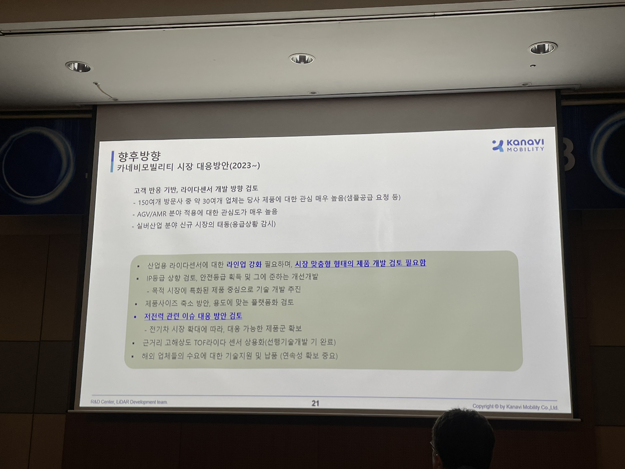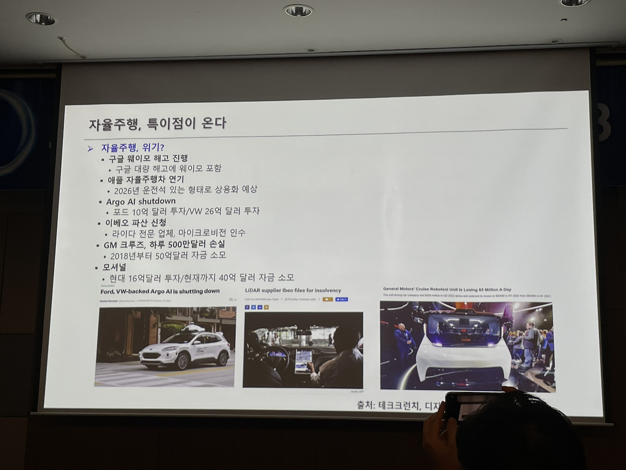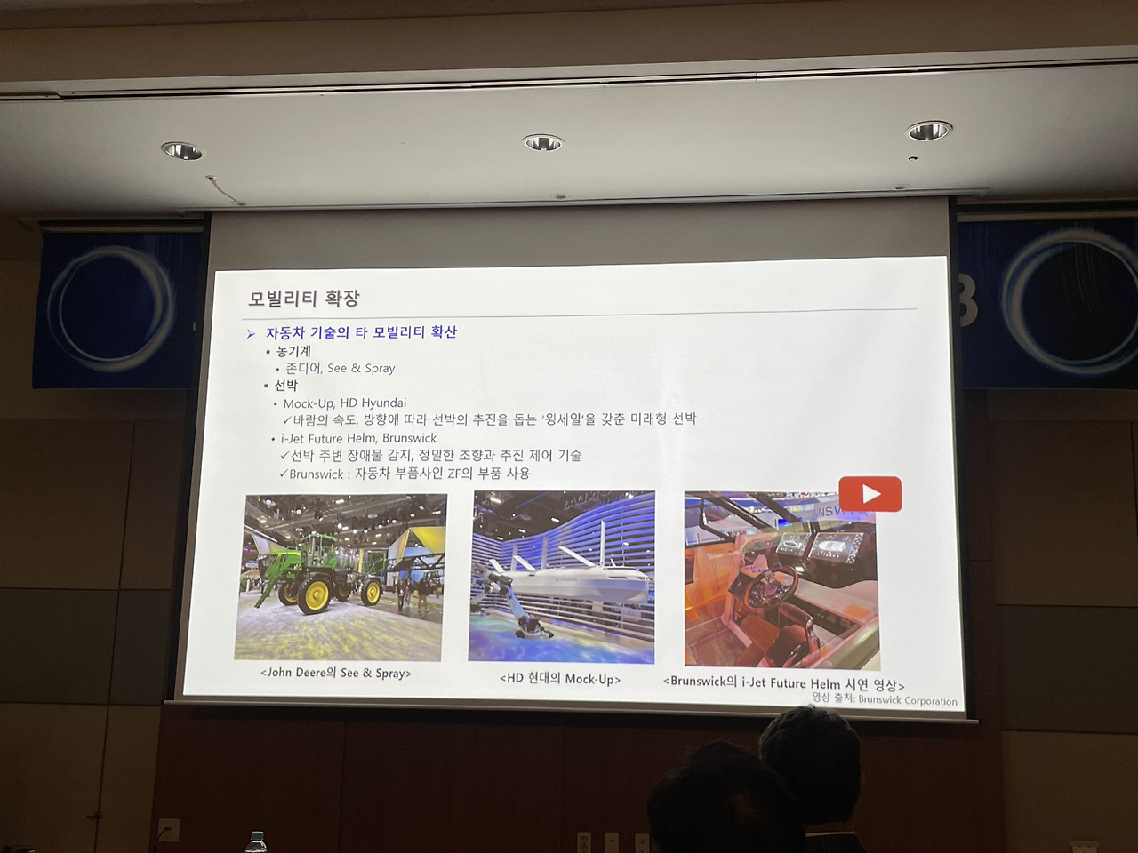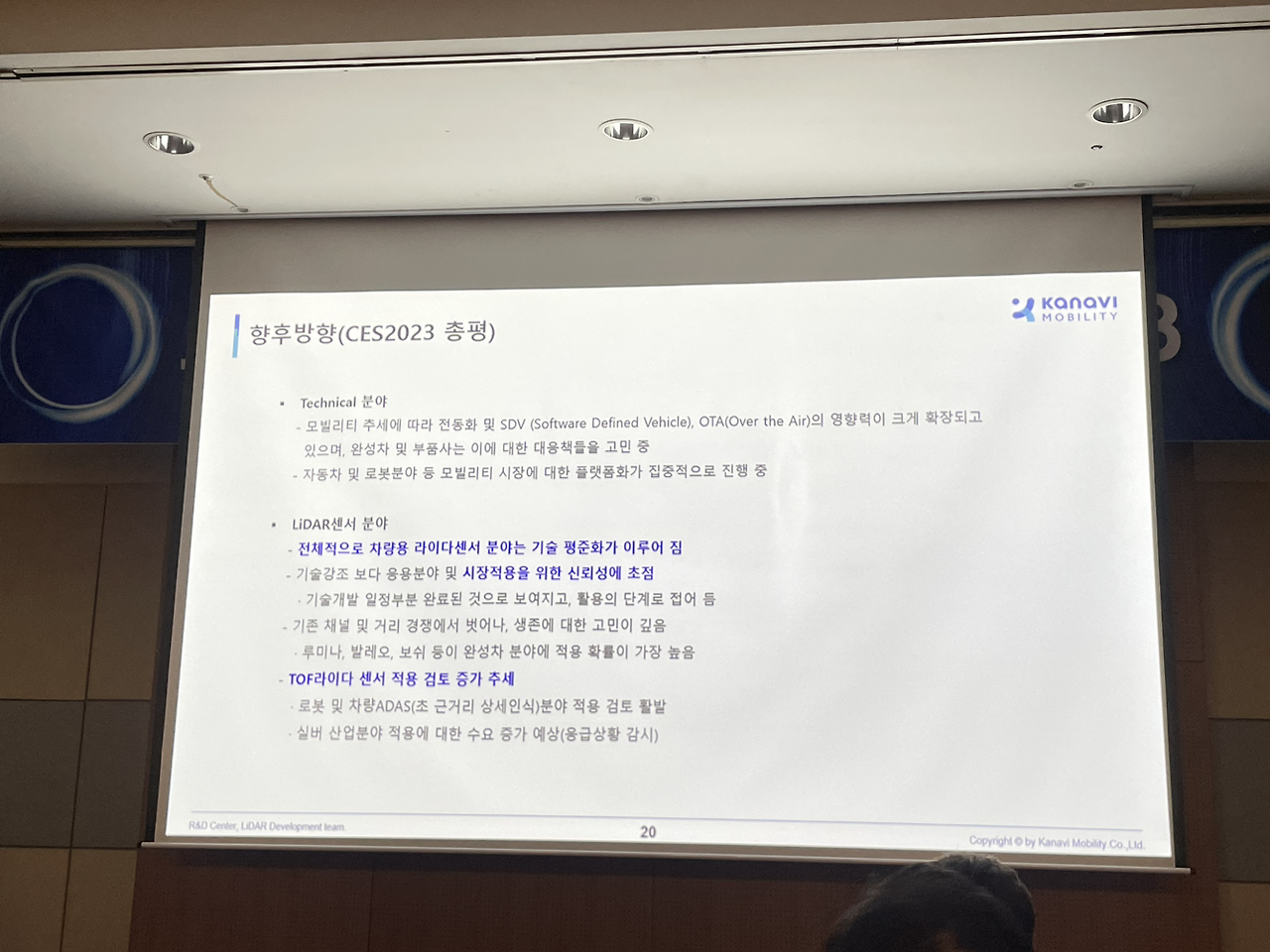 첫 발표는 카네비컴 정종택 회장이었습니다. 국내에는 블랙박스나 내비게이션 모듈 회사로 알려져 있고 저도 그렇게 알고 있었습니다. 근데 라이다, 특히 해양에서 쓰이는 제품군을 포함해 소프트웨어까지 굉장히 다양한 영역에서 활동하시더군요. 관련된 영역에서 회사가 오래 되고 경험이 많아 고생하는 발표자 회사등에게 대한민국이 감사해야 한다는 말씀을 하시더군요. 매우 인상 깊은 발표였습니다. V2X가 상용화되면 하이패스 단말기처럼 많은 차가 달게 되고 도로가 더 안전해질 것이라는 희망도 잘 들었고요.