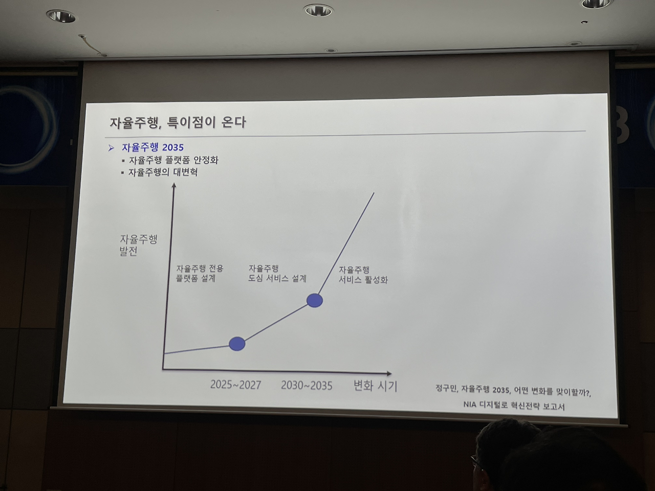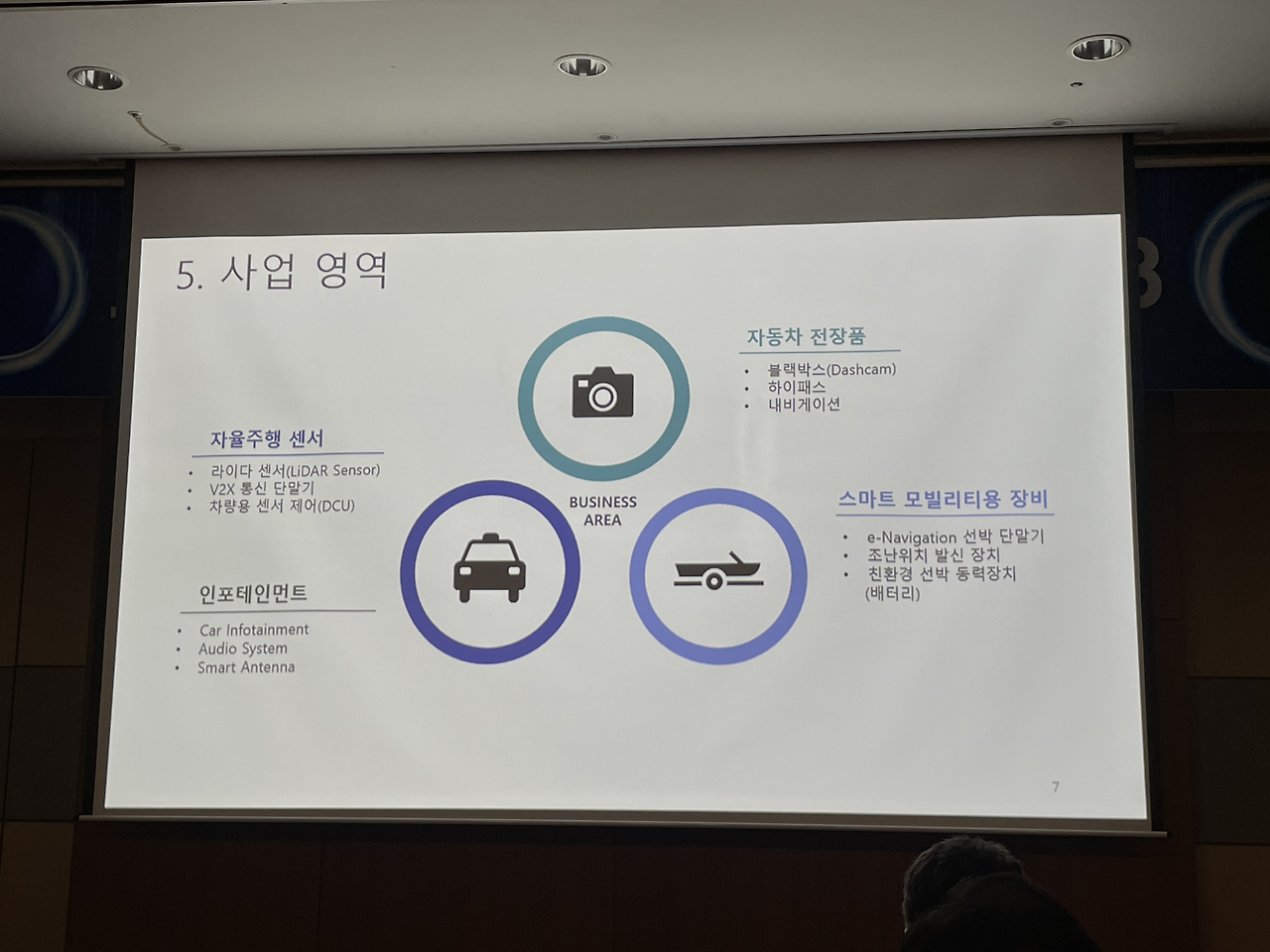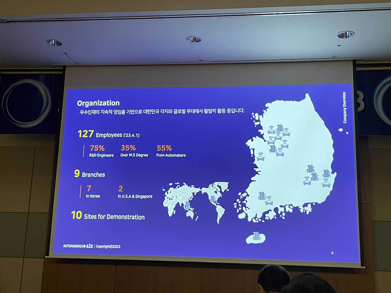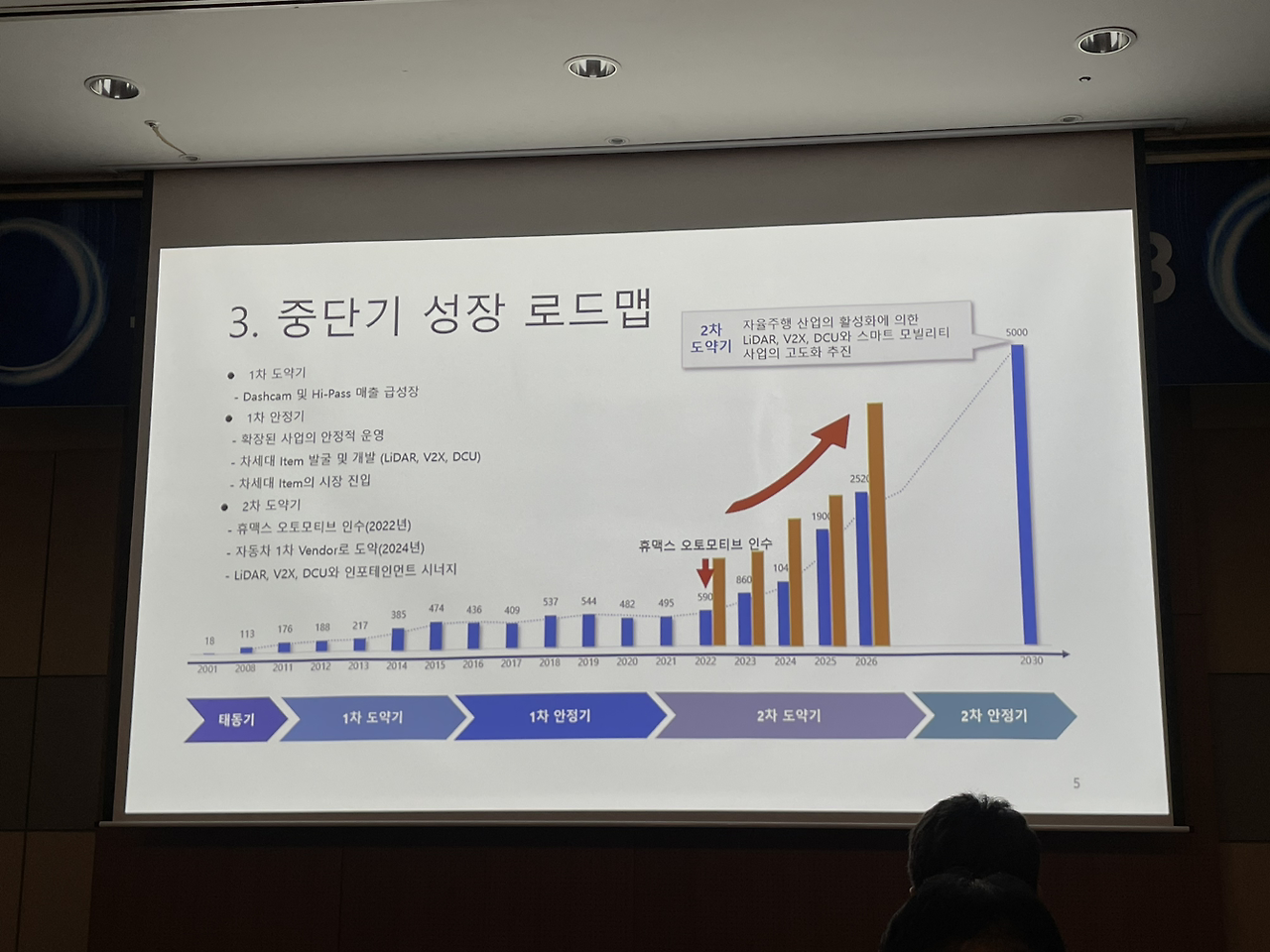 첫 발표는 카네비컴 정종택 회장이었습니다. 국내에는 블랙박스나 내비게이션 모듈 회사로 알려져 있고 저도 그렇게 알고 있었습니다. 근데 라이다, 특히 해양에서 쓰이는 제품군을 포함해 소프트웨어까지 굉장히 다양한 영역에서 활동하시더군요. 관련된 영역에서 회사가 오래 되고 경험이 많아 고생하는 발표자 회사등에게 대한민국이 감사해야 한다는 말씀을 하시더군요. 매우 인상 깊은 발표였습니다. V2X가 상용화되면 하이패스 단말기처럼 많은 차가 달게 되고 도로가 더 안전해질 것이라는 희망도 잘 들었고요.