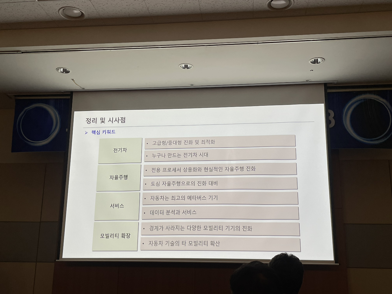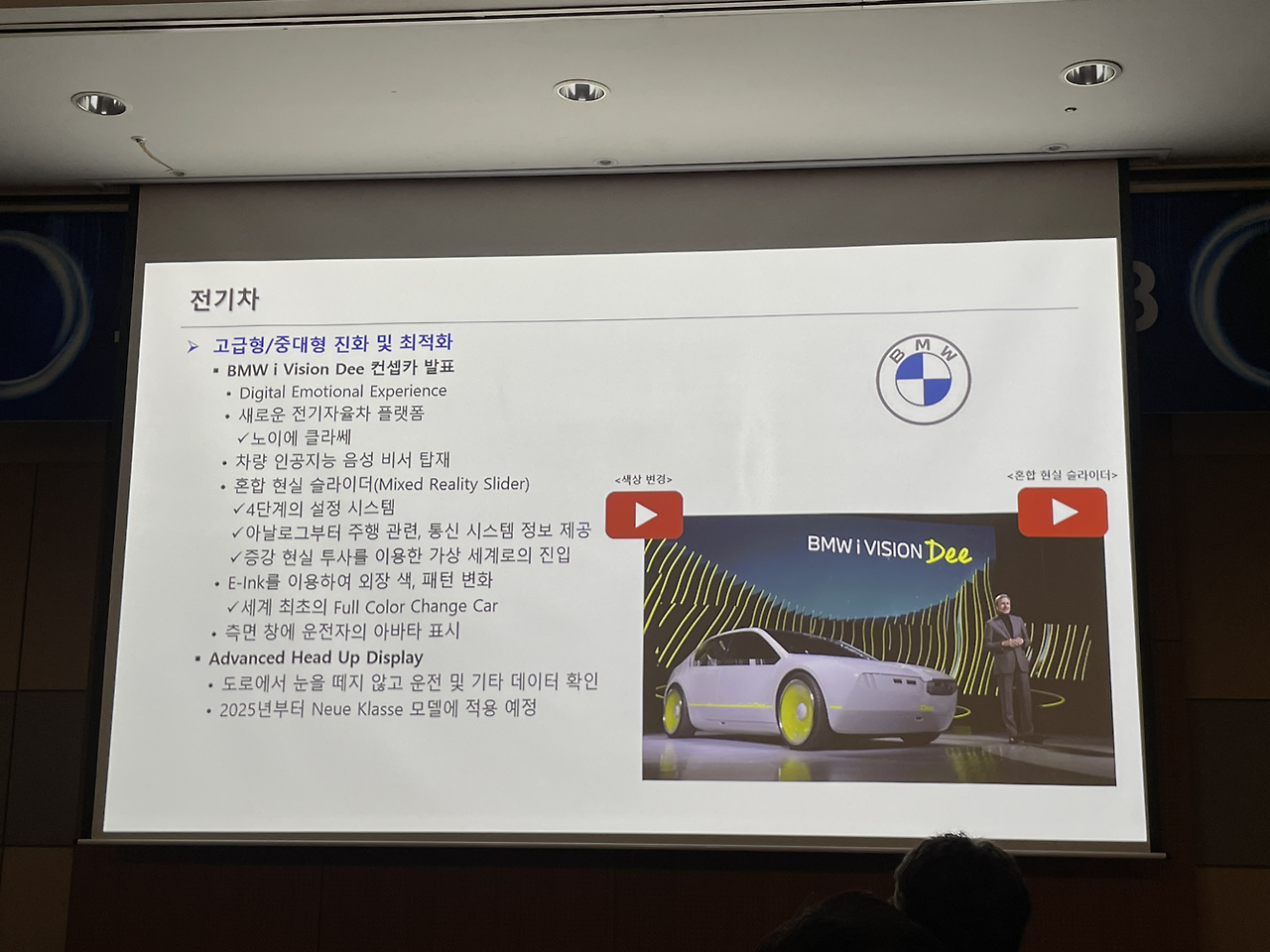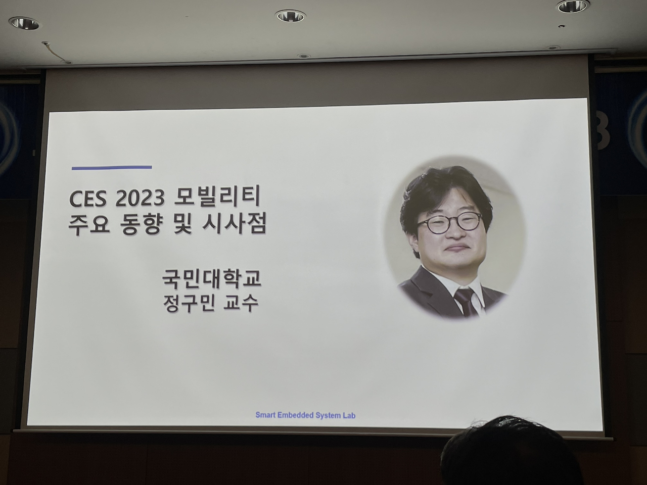마지막 발표로는 정구민 교수가 CES 2023 내용을 전체적으로 정리했습니다. 자율주행이 진화해 현실적이 되면서, 도심 외 구간을 달리는 것부터 시작하고 소프트웨어와 플랫폼이 안정화되었을 때 도심으로 들어올 것이라는 전망을 보여줬습니다. 또 빈페스트나 토그 등 1국가 1전기차, 차 안이 메타버스의 영역으로 바뀌는 것 등 역시 큰 그림에서 정리를 해주었습니다.