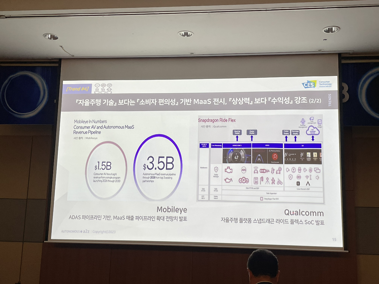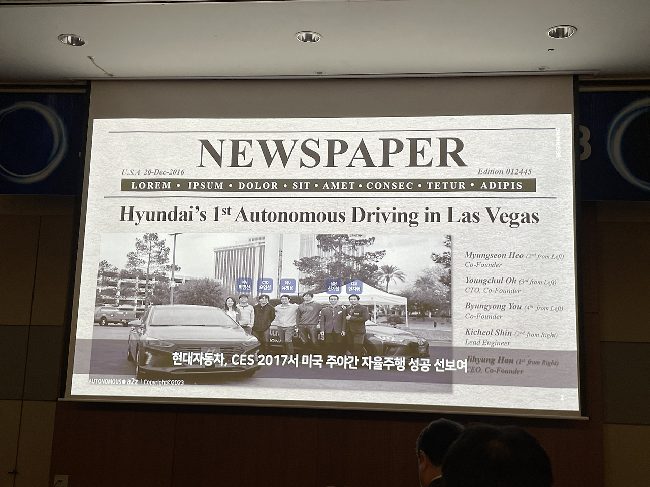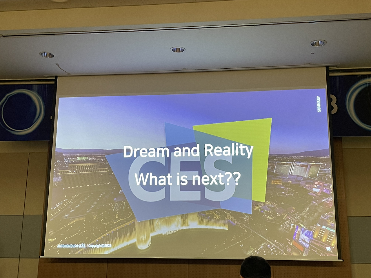 두번째는 오토노머스에이투지의 한지형 대표였습니다. 전체적으로 CES에 대해 정리를 해서 이해도를 높여줬습니다. 이제는 꿈과 현실에 대한 기준을 잡아야 할 시기가 되었고, 올해 사진에 있는 무인 자율주행차에 대한 개발과 완성에 집중하겠다고 하네요. 개인적으로는 현대자동차가 2017년 CES에서 라스베이거스 주변 도로를 달린, 아이오닉 자율주행차를 개발한 주인공이시라는 점이 매우 반가왔습니다. 그 영상 얼마나 자주 썼던지… ㅎㅎㅎㅎ