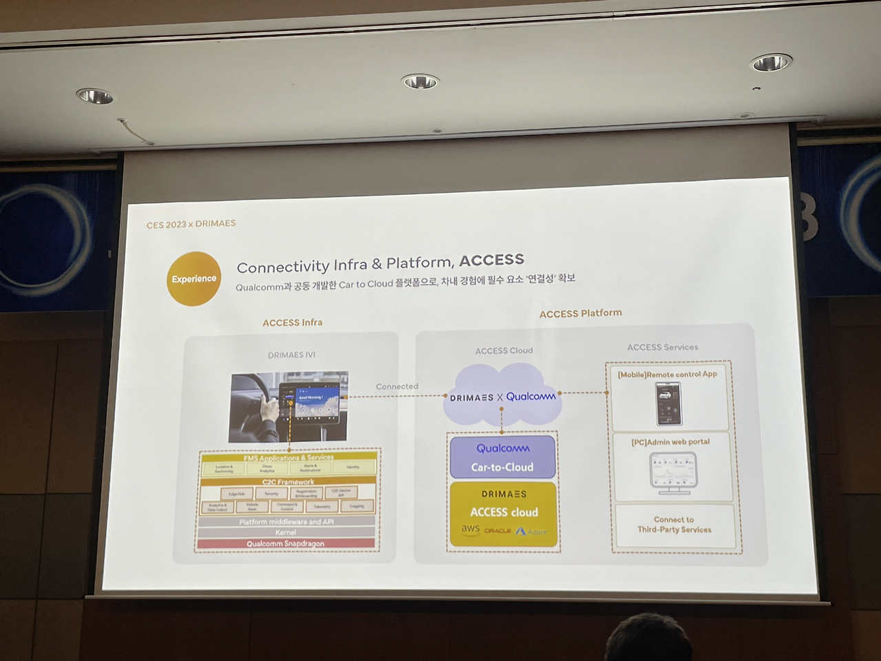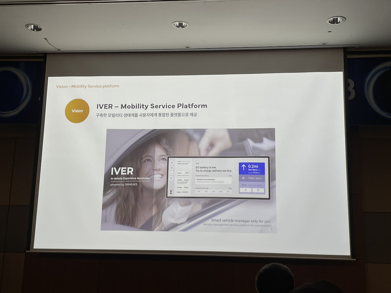 다음 발표는 드림에이스였습니다. 대외협력을 담당하는 김수진 매니저였고요, 고객 경험에서 매우 중요한 자동차 인포테인먼트 시스템 분야에서 활약하는 회사입니다. 자동차를 공간, 새로운 사용자 경험과 SDV에 대응하는 서비스를 갖고 계시더군요. 특히 전기차의 렌터카 등 플릿 매니지먼트와 사용자 편리성을 높여주는 아이버 서비스 등을 준비하고 있더군요. 서비스 제공을 위한 서드 파티들을 모집한답니다.