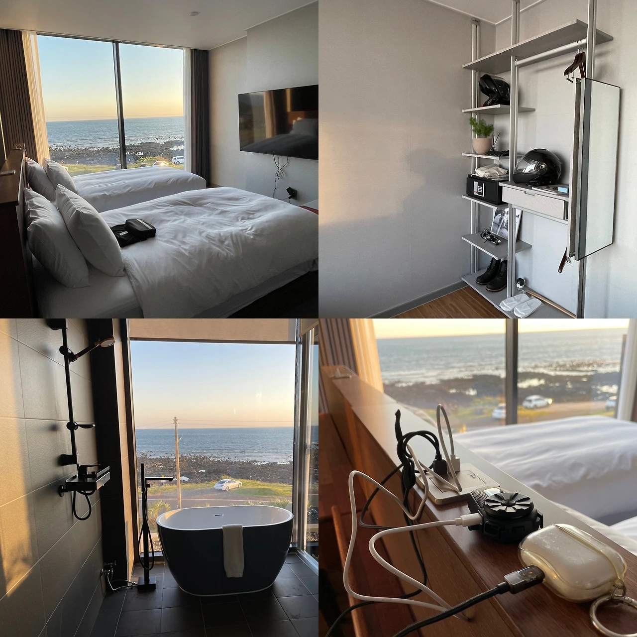 여기에 몇 번 포스팅으로 보여드린 숙소까지 완벽합니다. 창문을 열거나 욕조에 들어가면 바로 앞이 바다거든요. 또 바이크를 타면 블루투스 등 충전할 일이 많은데 USB 단자가 넉넉한 것도 좋더군요.