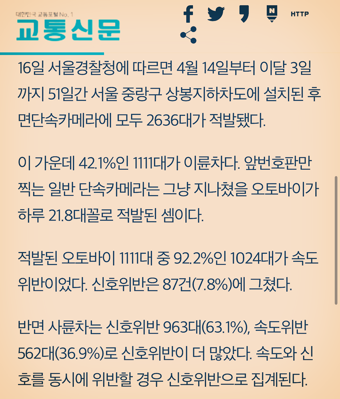 서울 상봉동에 설치된 후면 단속 카메라의 4월 14일부터 6월 3일까지 단속 결과를 보도하는 기사. 이 기간 2636대가 단속되었고 이중 42.1%가 이륜차라고 강조를 하는데…