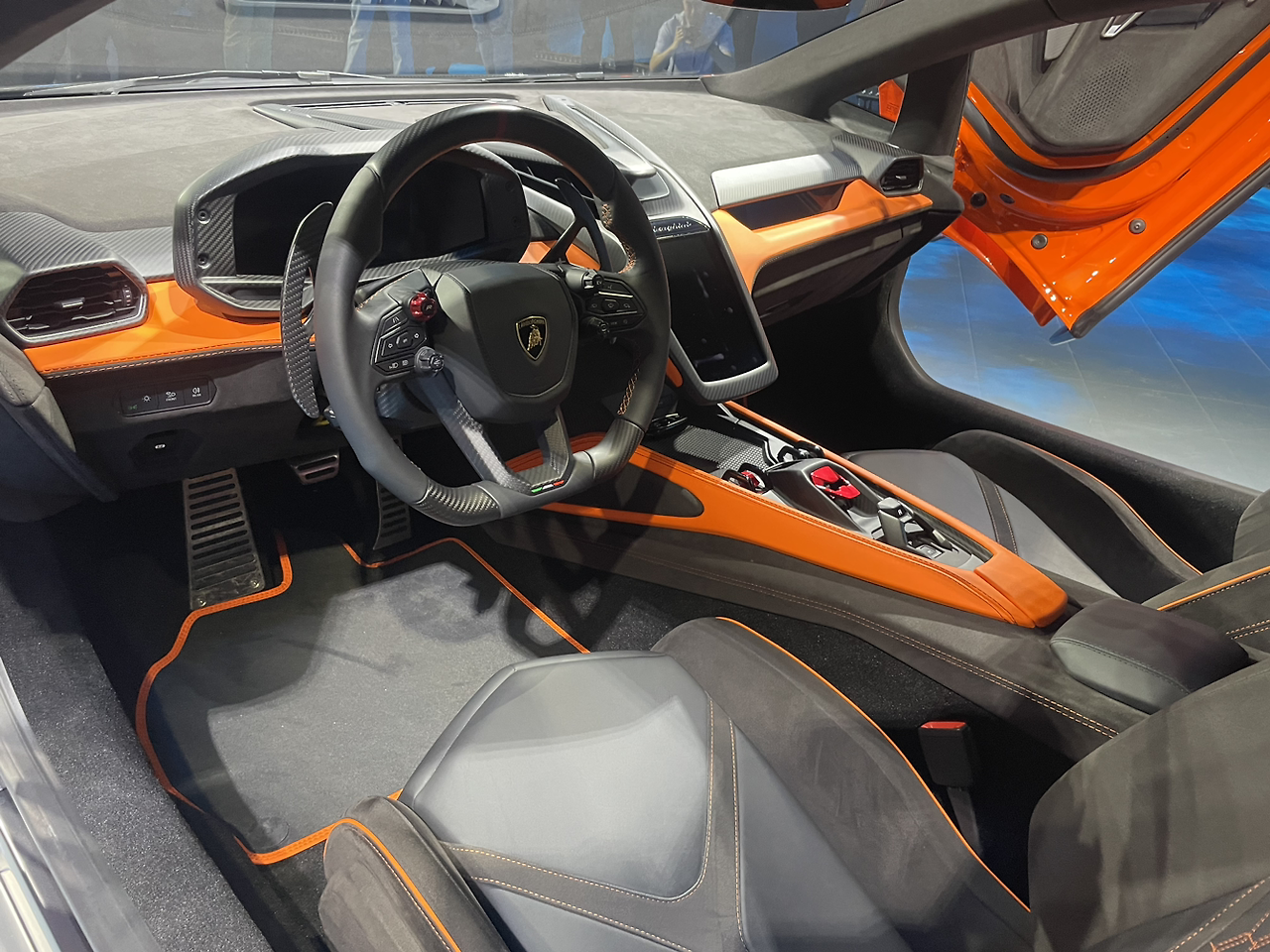 암튼 람보르기니스러우면서도 확실하게 미래적 느낌을 줍니다. 근데 자꾸 ‘전투기의 그것’ 이야기를 하던데… 람보르기니가 전투기, 아니면 비행기라도 뭔가 연계가 있나요? 단순히 엔진 스타트 버튼이 비행기처럼 커버 있는 토글 방식이라던가, 전 세대 모델들이 스텔스 전투기의 그것처럼 각진 디자인이라서 쓴다기에는 좀…